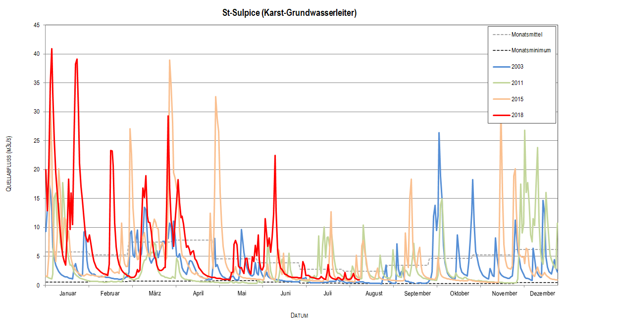 Les sources karstiques du Jura, comme celle de l’Areuse à St-Sulpice, présentent actuellement des débits légèrement plus élevés qu’en 2003 et en 2015 en raison des quantités de précipitations supérieures à la moyenne tombées depuis le début de l’année ainsi que des précipitations orageuses répétées au printemps et à l’été.