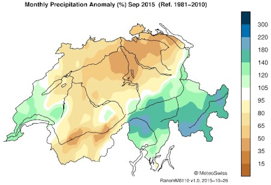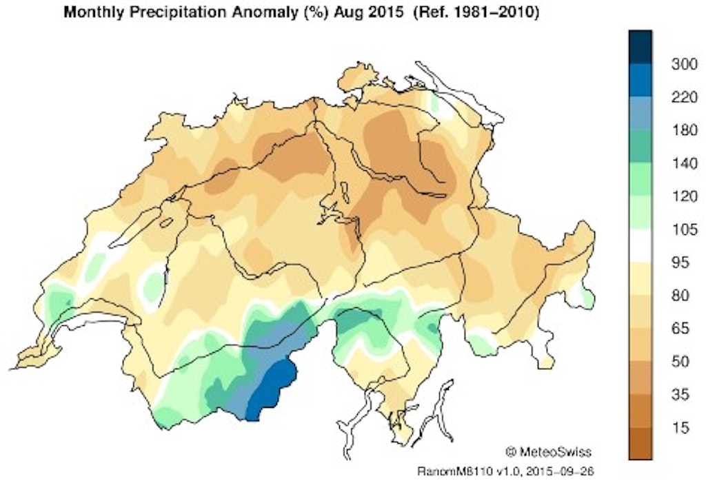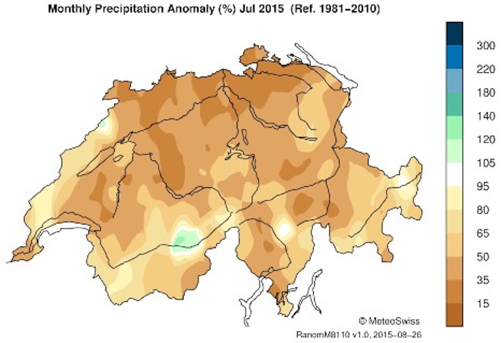 Depuis fin juin 2015, une grande partie de la Suisse a enregistré des quantités anormalement faibles de précipitations. La sécheresse qui en résulte a des conséquences visibles sur les niveaux des cours d’eau.