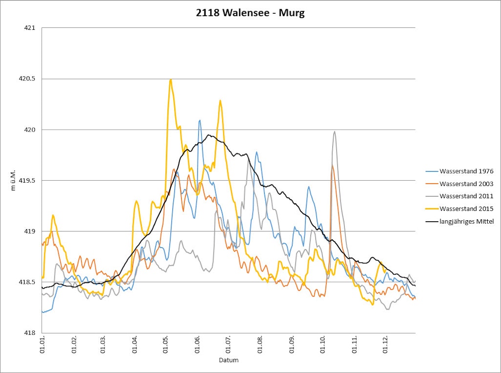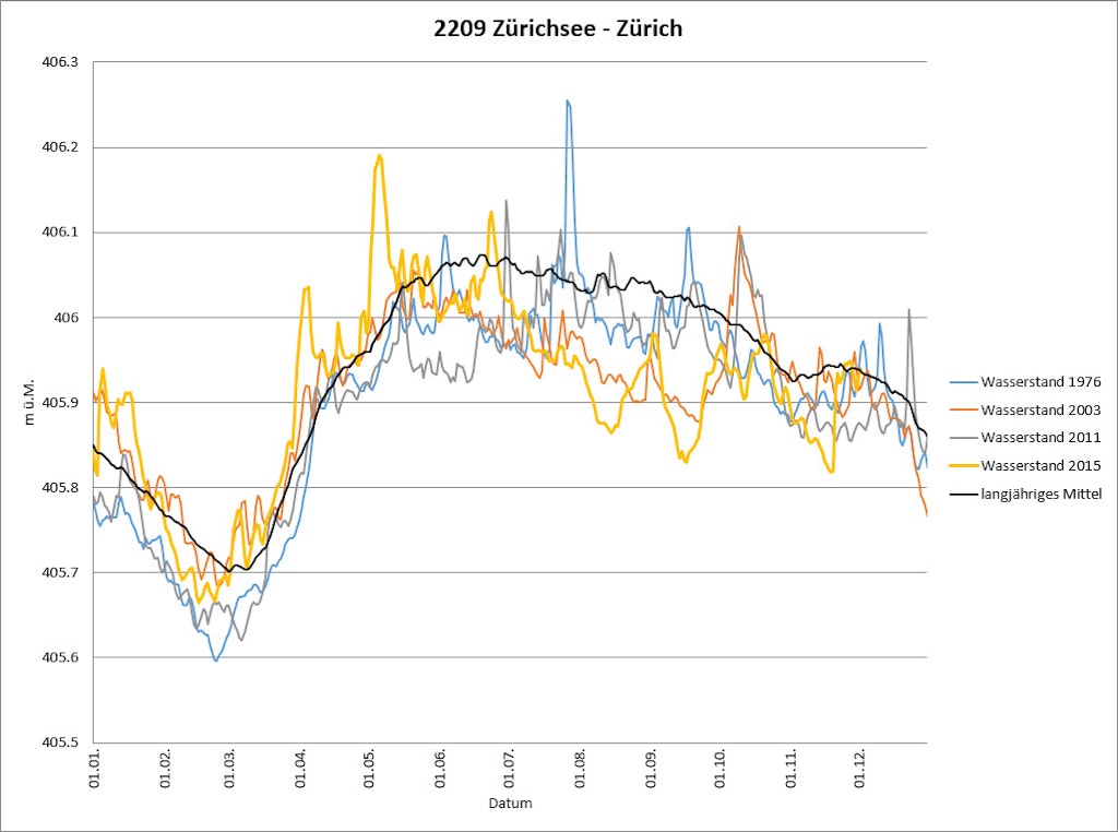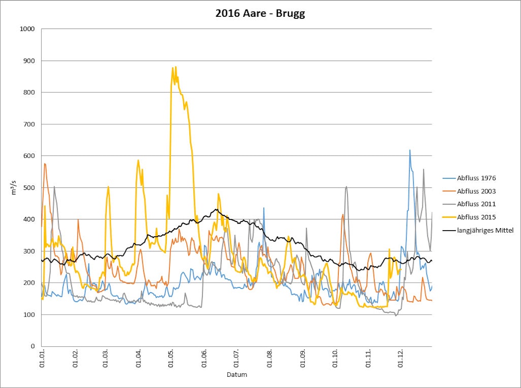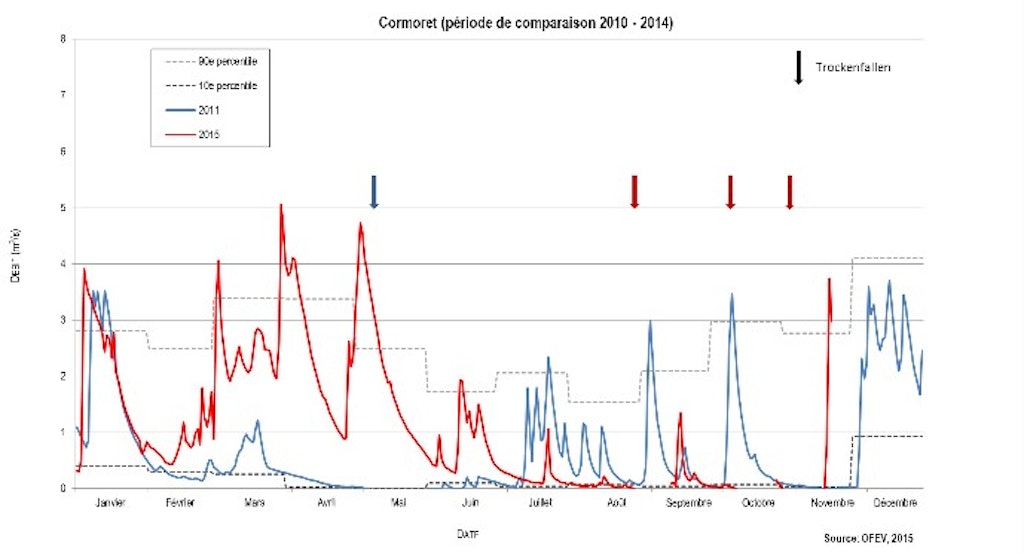 Comme le montrent les graphiques comparatifs avec d’autres années de sécheresse, la situation d’étiage de l’automne 2015 est comparable à celle de l’automne 2011. En effet, entre le 19 octobre et fin novembre 2011, il n’y a presque pas eu de précipitations en raison d’une situation de haute pression persistante. À l’inverse, sur toute la durée de l’automne 2015, aucune crue notable n’a été déplorée au nord des Alpes. Ainsi, entre mi-juillet et fin novembre, les niveaux et les débits d’eau sont restés invariablement en deçà des moyennes pluriannuelles dans de nombreux endroits. Alors que 2011 a eu un printemps très sec, celui de 2015 a été pluvieux, avec des précipitations abondantes début mai provoquant de grandes crues.