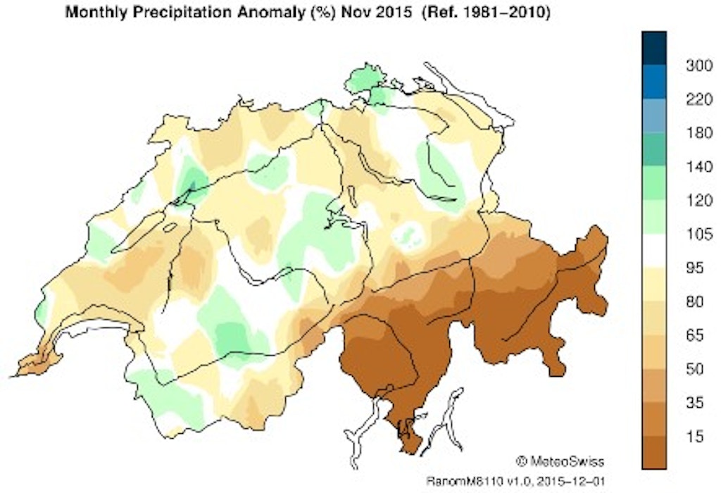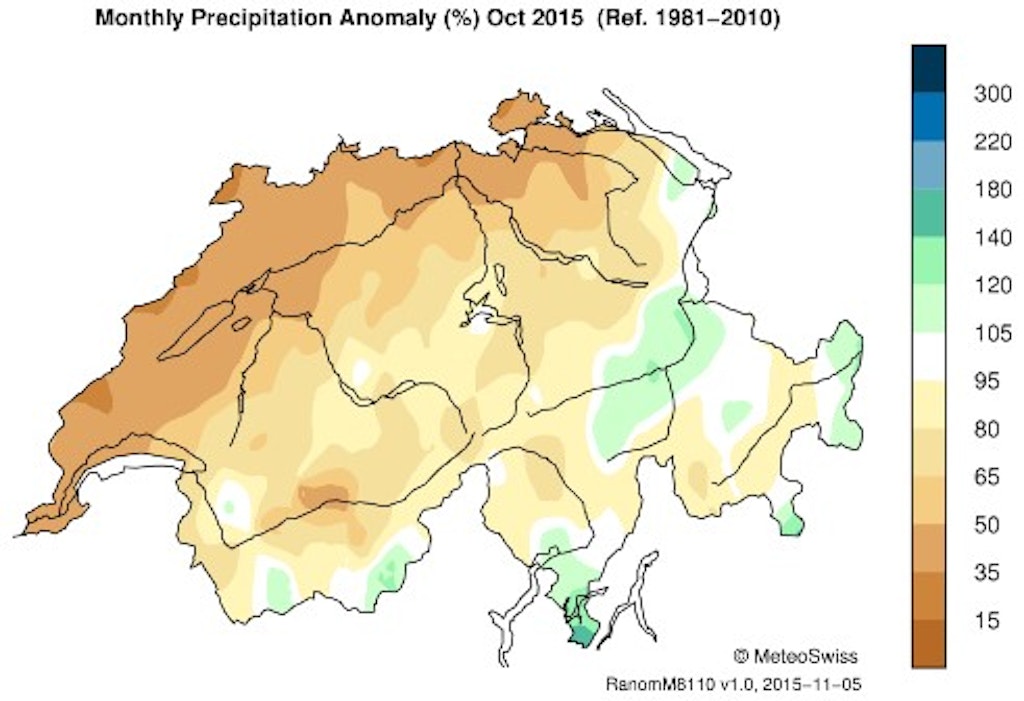 Cumul pluviométrique de juillet à novembre 2015 en pourcentage de la moyenne sur plusieurs années (source : MétéoSuisse)