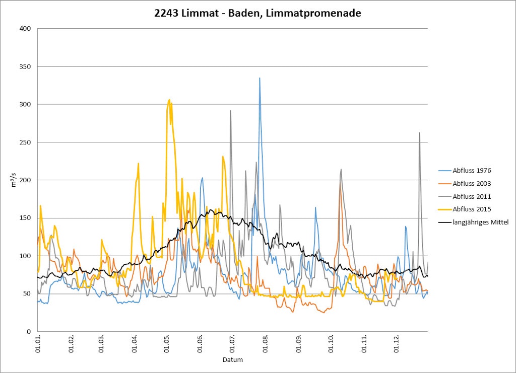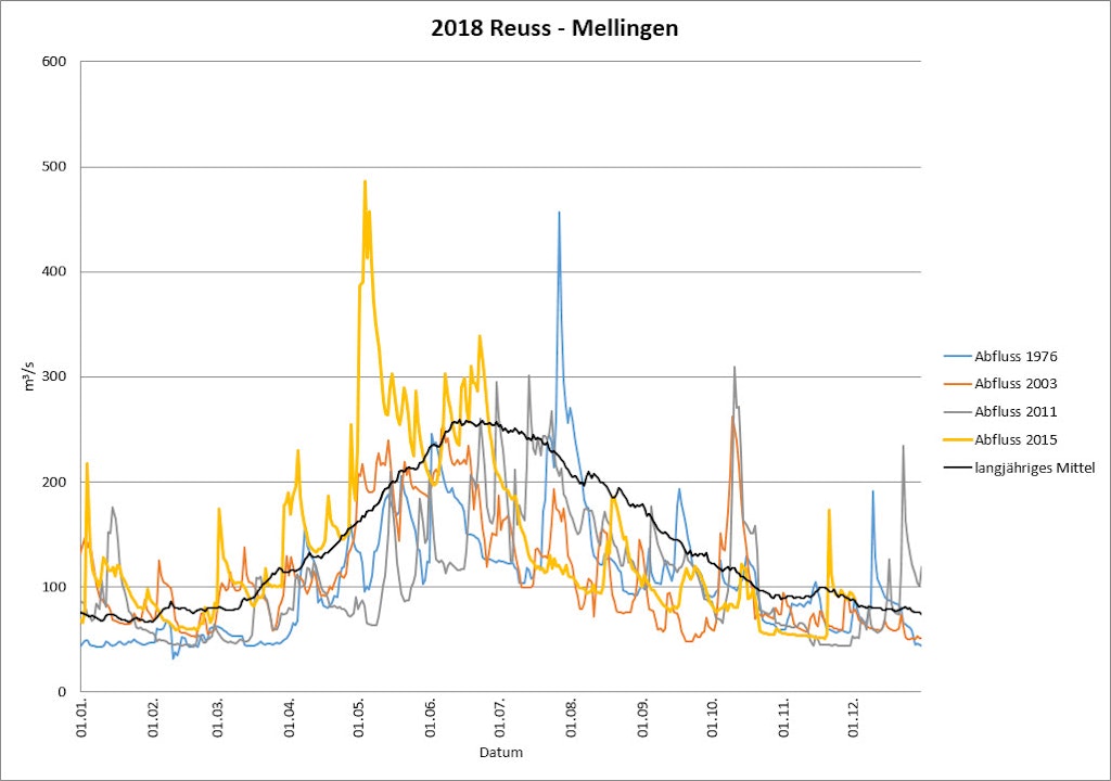 La situation d’étiage s’est d’abord limitée aux petits et moyens cours d’eau, qui réagissent plus rapidement ; puis, à partir de la mi-juillet, elle a aussi progressivement touché les grands cours d’eau, tels que l’Aar, la Limmat, la Reuss, la Thur et le Rhin. De nombreuses stations de mesure ont observé des débits qui statistiquement ne reviennent que tous les 2 à 10 ans. Dans certaines régions, les autorités locales ont instauré des restrictions et des interdictions de prélèvement dans les cours d’eau.