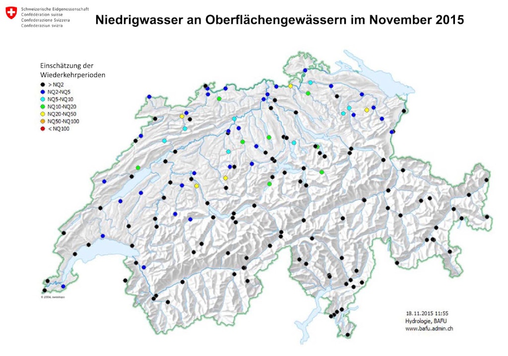 La situation d’étiage s’est encore aggravée pendant la forte sécheresse à partir de fin octobre. Il est vrai que les niveaux d’eau sont généralement plutôt bas en cette saison, cependant la situation est cette année plus marquée. Ainsi, mi-novembre, des niveaux correspondant aux minima saisonniers pluriannuels ont été mesurés pour de nombreux cours d’eau dans le Jura et sur le Plateau. Dans les zones touchées, une station hydrométrique sur cinq environ a mesuré des quantités d’eau qui sont statistiquement observées moins d’une fois tous les dix ans. Certains ruisseaux et tronçons de cours d’eau, comme le cours supérieur de la Töss, étaient même totalement secs, et localement, les poissons de certains cours d’eau ont dû être capturés et déplacés.