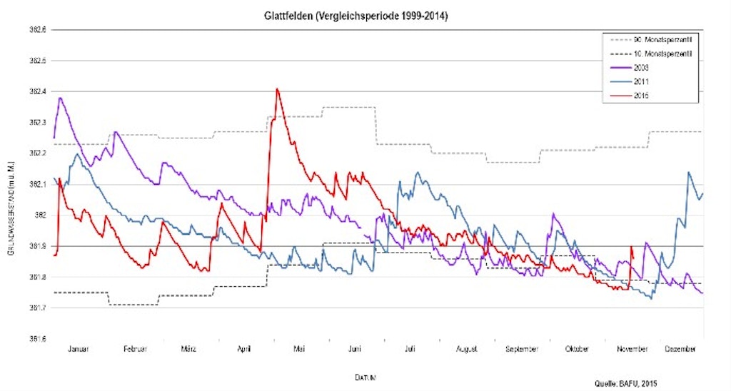 Niveau des eaux souterraines Glattfelden 2015 : comparaison avec 2003 et 2011.