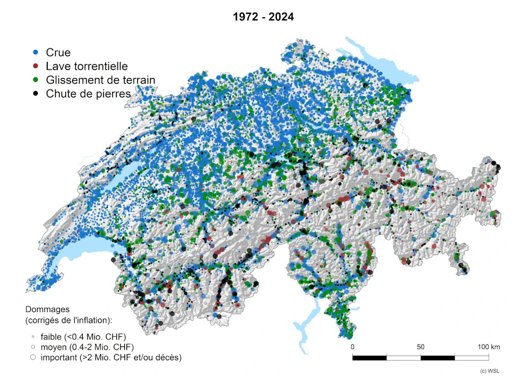 Entre 1972 et 2024, les crues, les laves torrentielles, les glissements de terrain et les processus de chute ont provoqué en moyenne des dommages à hauteur d'environ 321 millions de francs par an. Ces dommages sont, à plus de 90 %, dus aux crues et aux laves torrentielles.
