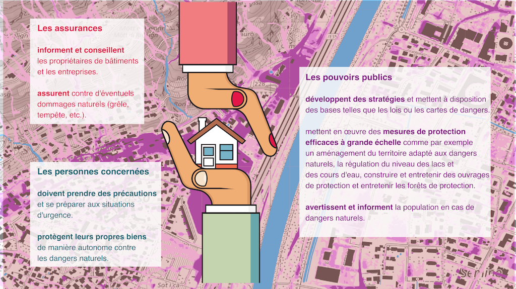 Enfin, les planificateurs-trices, les entreprises de transport, les exploitants-es d’installation et les citoyens-nes ont un rôle à jouer, dans la mesure où ils doivent tenir compte des dangers naturels dans leurs décisions.