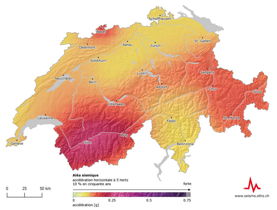Carte de l’aléa sismique — © © SED ETH Zürich Que peut-il se passer à votre domicile ? Votre lieu de travail, votre appartement de vacances ou votre place de camping sont-ils menacés ?