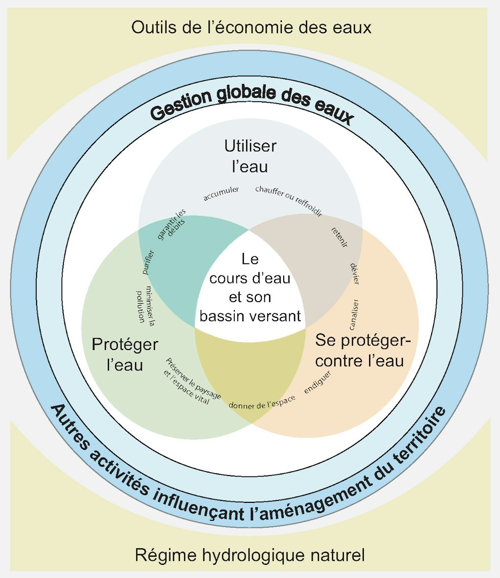 Souvent l'on a confondu la notion de gestion des eaux avec celle, très restrictive, d'exploitation économique de l'eau. D'importants progrès ont été réalisés au cours des 50 à 100 dernières années dans les différents secteurs de la gestion des eaux. La propension à faire valoir dans ce domaine des intérêts particuliers sans tenir compte d'autres objectifs légitimes appartient désormais au passé. Il apparaît aujourd'hui que les problèmes qui se poseront à l'avenir, notamment en raison des changements climatiques, d'une utilisation accrue de la force hydraulique ou des nouvelles formes de pollution, requièrent une approche non plus sectorielle, mais globale.