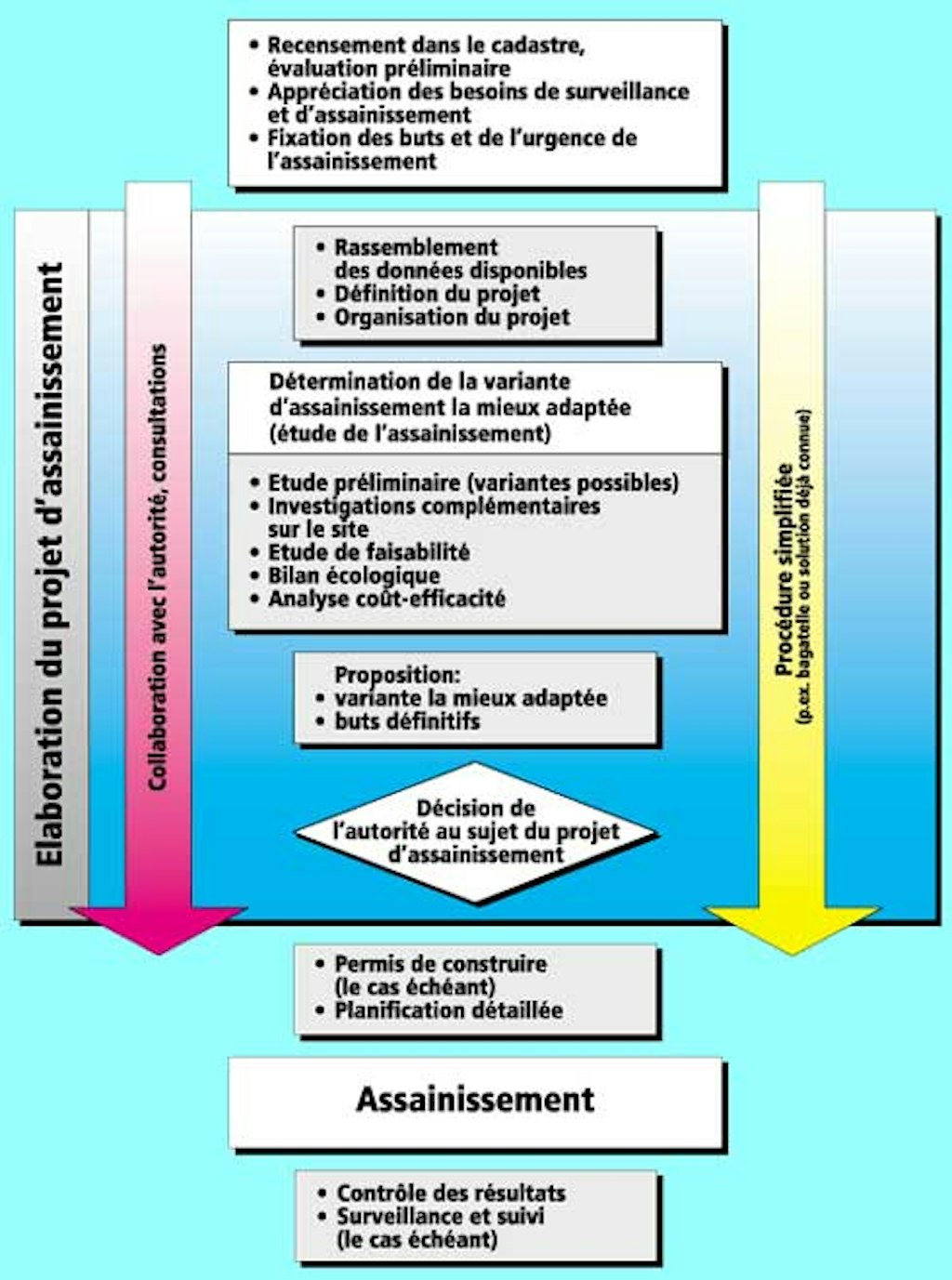 Il est indispensable de disposer de bases solides si l'on veut que le procédé d'assainissement soit bien adapté et durable. C'est la raison d'être du projet d'assainissement, qui sera élaboré par la personne tenue à l'assainir. Les mesures à prendre, adaptées aux cas particuliers, sont notamment mises au point dans le cadre de ce projet. On les voudra judicieuses au plan écologique, techniquement réalisables et financièrement supportables. Le projet d'assainissement fournit à l'autorité un instrument lui permettant d'évaluer les mesures prévues et de fixer définitivement, d'entente avec la personne concernée, les buts de l'assainissement et les mesures à prendre.