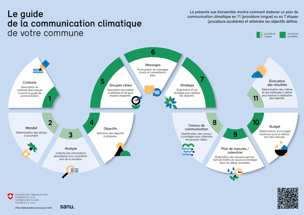 Le guide de la communication sur le climat aide les petites et moyennes communes à communiquer sur le climat. Outre des instructions pour élaborer des concepts de communication (en 11 ou 7 étapes), de nombreux conseils concrets et des listes de contrôle pour réussir sa communication sur le climat, le guide contient également un aperçu de tous les canaux de communication, une collection de bons exemples de communication ainsi que des modèles pratiques.