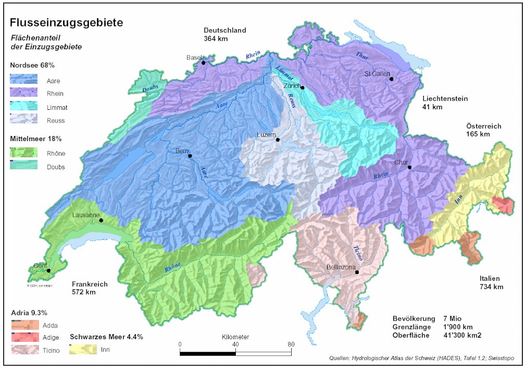 Le Rhin, qui se jette dans la mer du Nord, draine la plus grande partie du territoire suisse (67%). En conséquence, les bassins versants des cours d’eau qui s’écoulent vers la Méditerranée (Rhône 18%), l’Adriatique (Pô, 9.3%) et la mer Noire (Danube, 4.4%) sont sensiblement plus petits.