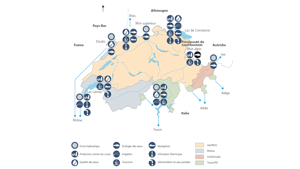 Les pays voisins et les riverains de l’aval de la Suisse utilisent l’eau s’écoulant au-delà des frontières. Il existe donc, depuis des décennies, des conventions internationales, des traités entre États et des organismes spécifiques qui définissent les modalités de la coopération et fixent des objectifs relatifs aux eaux transfrontalières.
