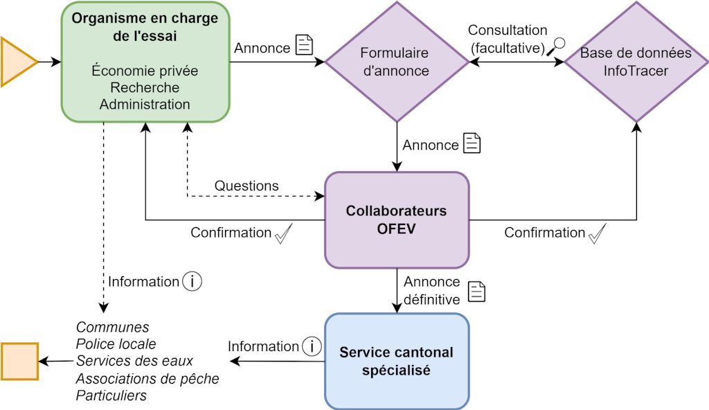 Les responsables de la réalisation des essais de traçage (bureaux privés, instituts de recherche, autorités, etc.) sont priés d’annoncer leurs essais suffisamment tôt – au minimum deux semaines à l’avance – à InfoTracer.