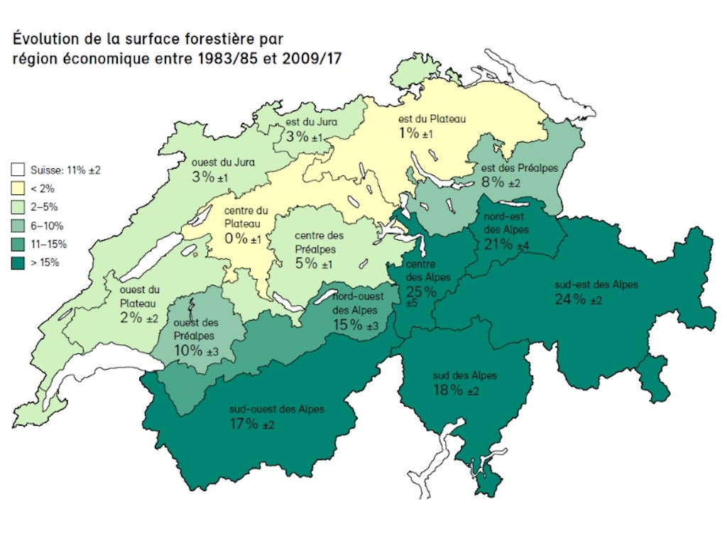 La part de la surface forestière sur laquelle il n'y a guère de jeunes arbres (degré de recouvrement de la régénération <5%) a fortement augmenté (+25,4 ± 6,0 %) et représente désormais près d'un tiers de la surface forestière (31,6 ± 1,4 %).