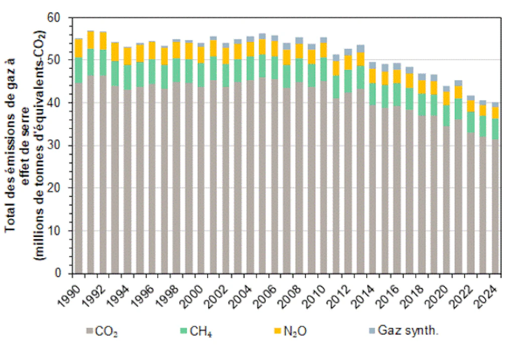 L’inventaire des gaz à effet de serre de la Suisse est actualisé chaque année en avril sur la base des données de deux années avant. Les données présentées ci-après sont issues de l’inventaire des gaz à effet de serre d’avril 2026 (prochaine actualisation : avril 2027).