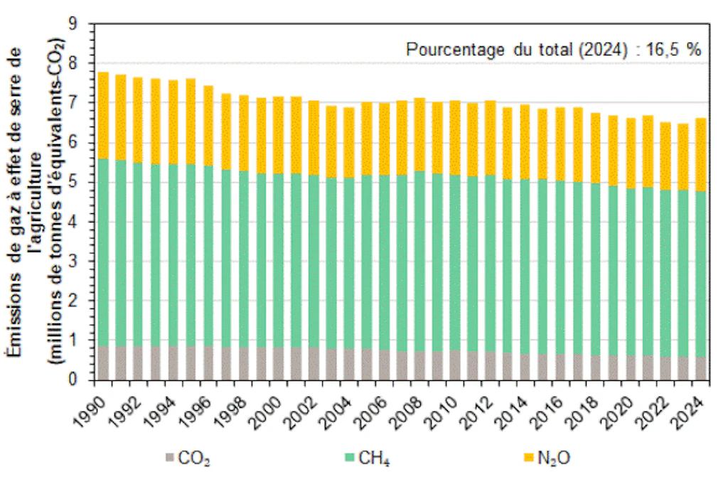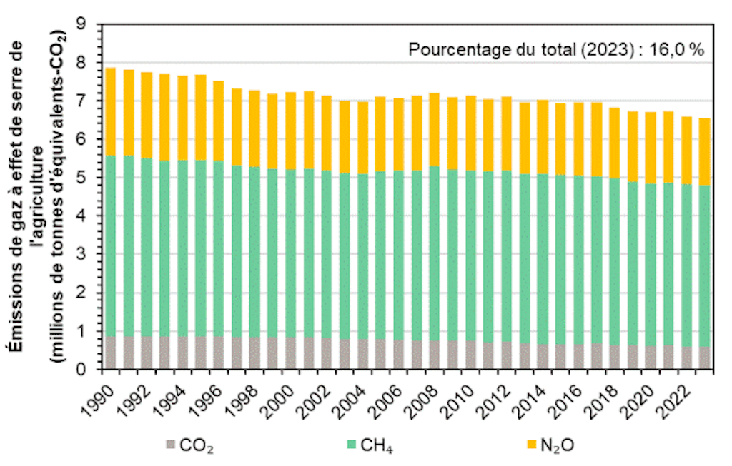 Les activités agricoles sont non seulement à l’origine des émissions mentionnées ici, mais exercent également un impact sur le bilan des gaz à effet de serre des sols agricoles dans le secteur de l’utilisation des terres. Les émissions et absorptions associés sont présentées sur la page web suivante :