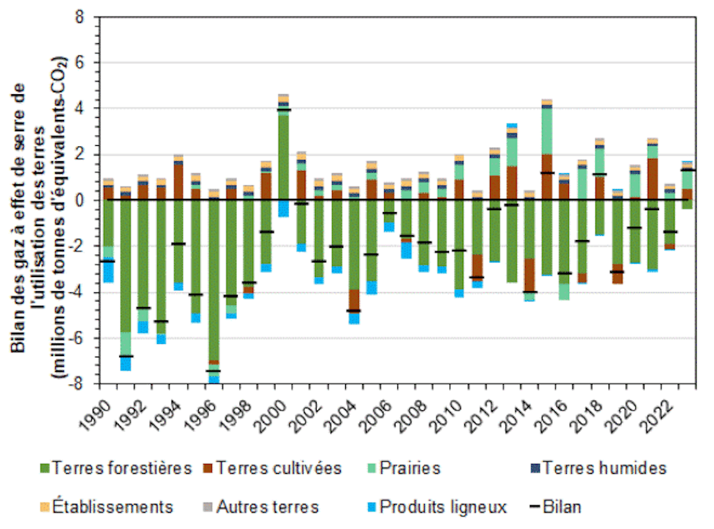 À l’exception des années 2000, 2015, 2018 et 2023 l’utilisation des terres en Suisse a permis de capter, par la végétation et les sols, plus de CO2 qu’il n’en a été rejeté dans l’atmosphère. Les émissions annuelles nettes de gaz à effet de serre de la Suisse ont diminué grâce à cette prestation écosystémique.