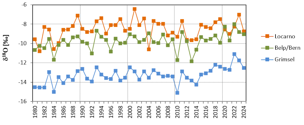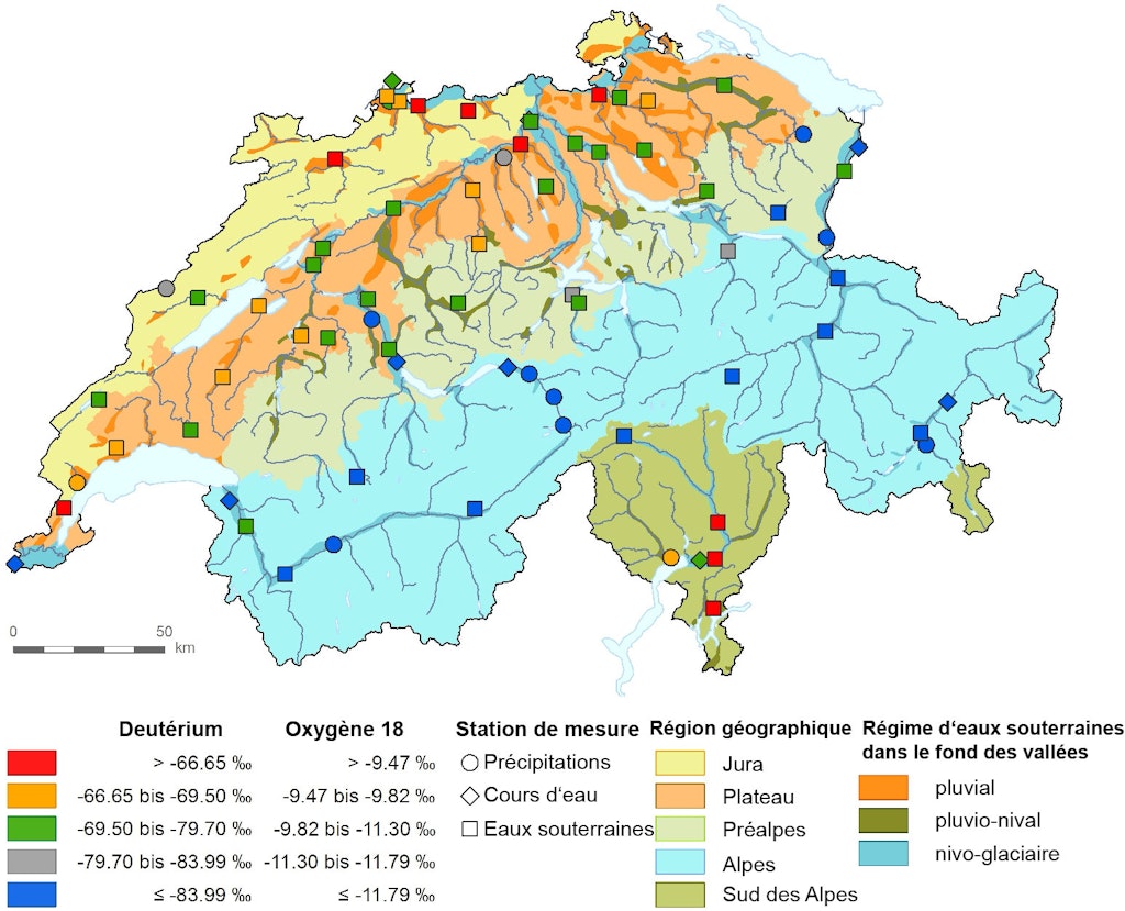 De par la signature isotopique des précipitations, qui diffère en fonction de la région, de l’altitude et de la saison, les isotopes stables de deutérium (2H) et d’oxygène-18 (18O) permettent d’évaluer l’altitude moyenne des bassins versants fluviaux et de distinguer les différents composants dans les eaux souterraines (eaux fluviales et infiltrations des précipitations). L’utilisation du deutérium et de l’oxygène-18 se fait toujours plus fréquente dans le monde pour mesurer les répercussions des changements climatiques sur le cycle de l’eau. Le Système national d’observation du climat utilise le deutérium et l’oxygène-18 depuis 2007 comme paramètre climatique officiel. L’Agence internationale de l’énergie atomique coordonne les mesures des isotopes au niveau international et exploite à cet effet les réseaux internationaux de mesure des isotopes dans les précipitations et dans les cours d’eau (Global Network of Isotopes in Precipitation et Global Network of Isotopes in Rivers).