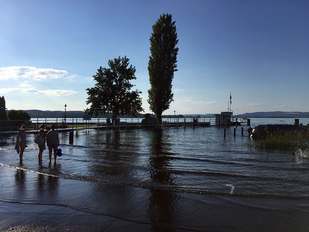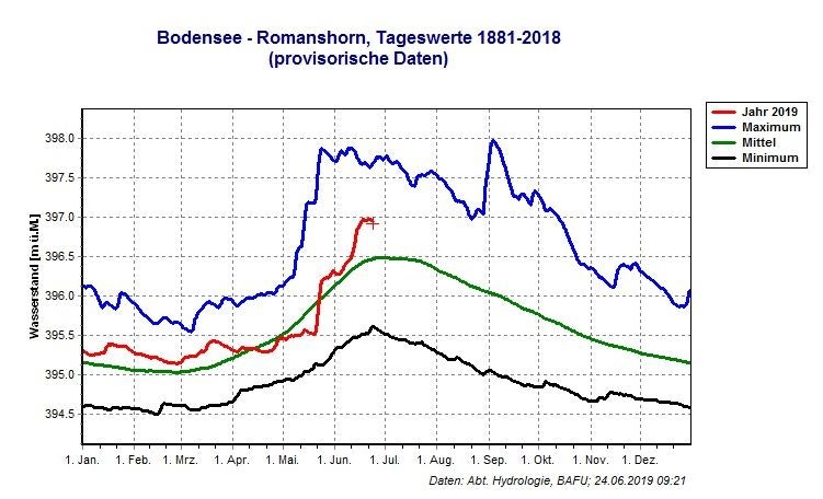 Il n’est pas tout à fait inhabituel que le lac de Constance atteigne ce niveau. Les années précédentes, la station de mesure de Romanshorn a enregistré de tels niveaux à plusieurs reprises, en juin 2016 (397,35 m) et en juin 2013 (397,04 m.). L’an dernier, la situation était complètement différente : fin juin 2018, le niveau du lac se situait à 395,1 m et s’est abaissé à 394,92 m en raison de la longue période de sécheresse qui a sévi jusqu’en octobre.