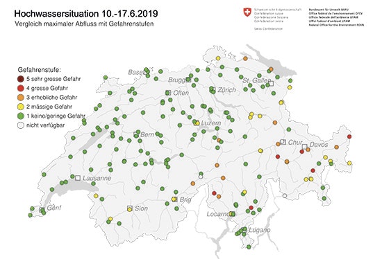 De fortes pluies se sont abattues sur la Suisse entre lundi 10 et vendredi 14 juin 2019, essentiellement sur le Tessin ainsi que le centre et l’est du pays (cf. Auswertungen von MeteoSchweiz unter «Links»). Dans toute la Suisse, les niveaux d’eau se sont fortement élevés et restent, par endroit, supérieurs à la moyenne, en particulier dans les régions marquées par une fonte intensive des neiges et des glaciers.