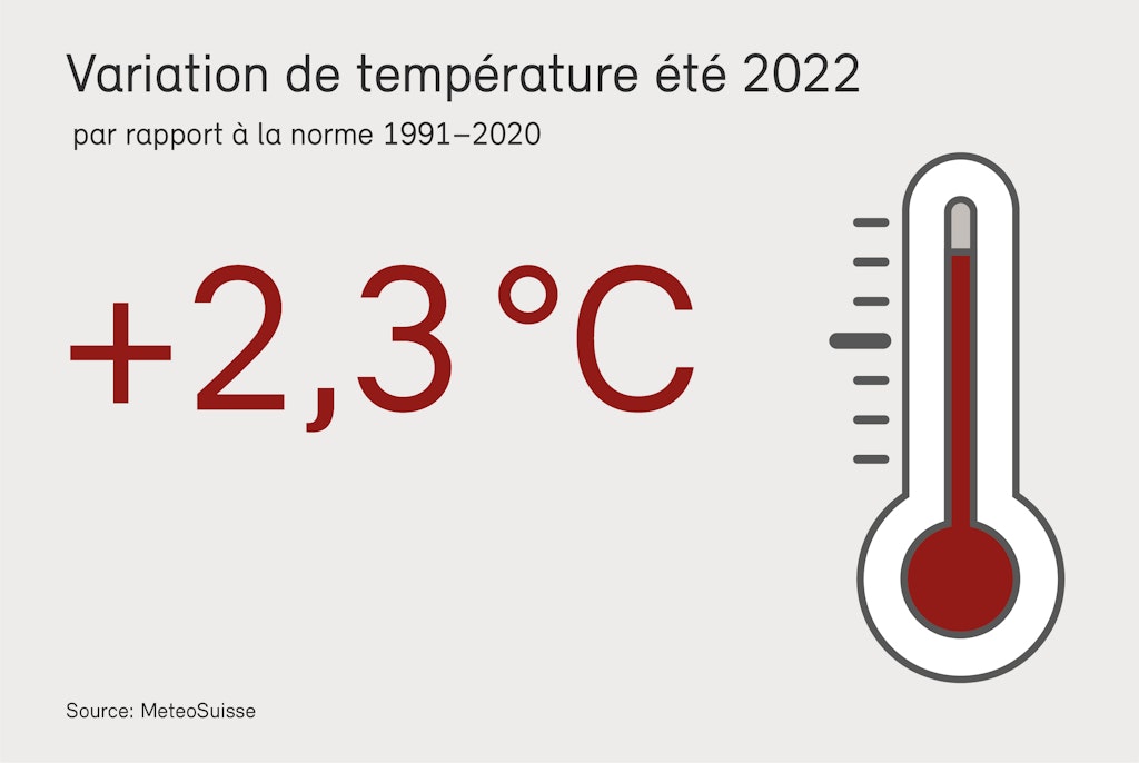 L’année 2022 a été l’année la plus chaude et la plus ensoleillée depuis le début des mesures en 1864. Alors que la température moyenne annuelle de la période de 1991 à 2020 se situait à 5,8 °C, celle de 2022 a grimpé à 7,4 °C. Il s’agit là de la température la plus élevée enregistrée au cours de la poussée de chaleur que nous vivons depuis 2010. D’ailleurs, pas moins de sept records ont été atteints au cours de cette période. Dans l’ensemble, la température moyenne annuelle est montée de 2 °C.
