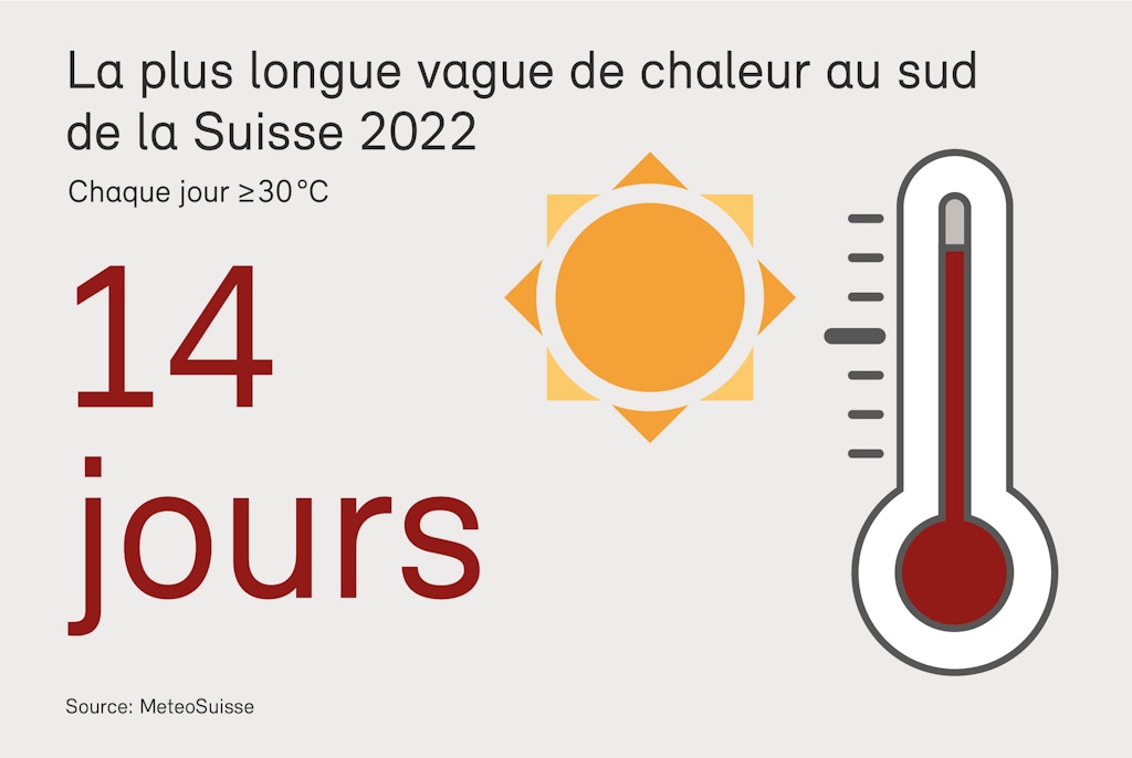 Dans le sud des Alpes, l’hiver 2021/2022 a été le deuxième le plus clément et le plus ensoleillé depuis le début des mesures. Le printemps a lui aussi été particulièrement doux, avec le deuxième mois de mai le plus chaud depuis le début des mesures. Puis l’été s’est placé en deuxième position. Dans le sud comme dans le nord de la Suisse, des températures supérieures à 36 °C ont été enregistrées. Seul l’été caniculaire de 2003 – véritable été du siècle – a été plus chaud.