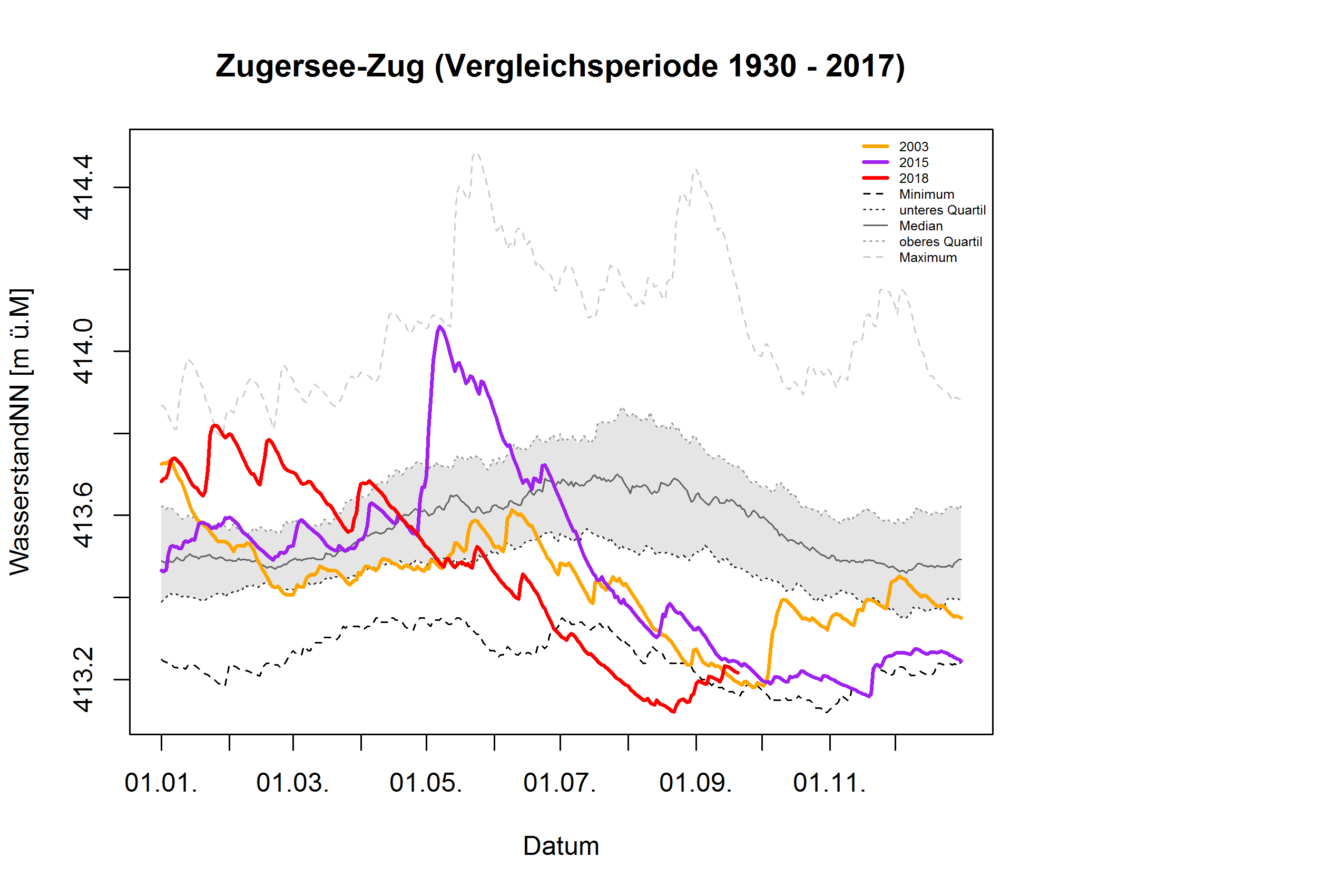 Si les niveaux de certains lacs régulés (lacs de Thoune et de Bienne, p. ex.) sont partiellement normaux, ceux du lac de Zoug et du lac Majeur sont toujours bas. Sur le Plateau, les lacs de Baldegg, de Hallwil et de Sempach affichent actuellement des bas niveaux qui n’apparaissent que tous les 10 à 30 ans.