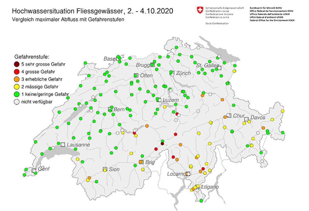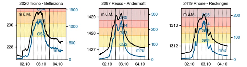 Du fait des intenses précipitations, les niveaux des lacs et des cours d’eau des régions concernées ont rapidement monté dès vendredi midi 2 octobre. Les débits de la Reuss à Seedorf (UR) et la Lütschine à Gsteig (BE) atteignaient déjà dès les premières heures du samedi le degré de danger 4. D’autres ont suivi durant la matinée, comme la Reuss à Andermatt (UR), le Rhône à Reckingen (VS) et la Moesa à Lumino (TI). La Goneri, qui alimente le Rhône à Goms, a même franchi le seuil du degré de danger 5.