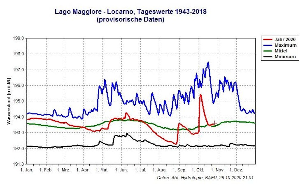 À l’époque, les niveaux du lac Majeur s’étaient accrus de 1,3 m. En octobre, ils ont augmenté d’environ 2,5 m. À titre de comparaison, ils étaient montés d’environ 3,5 m en quatre jours lors des crues d’octobre 2000. Samedi matin, le lac a vu son niveau gagner 12 cm par heure, car le Toce, la Maggia et le Ticino y déversaient plus de 6000 m3/s. Une fois la fin des précipitations, le lac, qui a débordé par endroits, a atteint dans la nuit de dimanche à lundi son plus haut niveau, soit 195,46 m, tout juste en dessous du seuil de danger 3. Il présentait alors un niveau bien supérieur à la moyenne saisonnière (voir graphique ci-dessous).