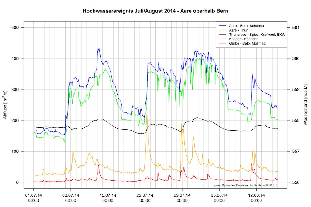 Crue de l’Aar : débit et niveau aux stations de l’OFEV entre le lac de Thoune et Berne, et sur la Gürbe, de juillet à mi-août 2014.