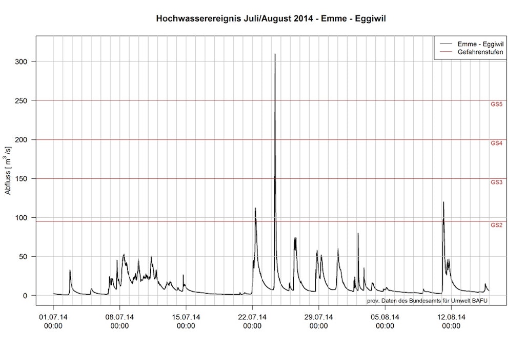 - 24 juillet : un violent orage local sur le cours supérieur de l'Emme a entraîné une crue centennale (niveau de danger 5). La station Emme-Eggiwil a même relevé un nouveau record absolu. Plus en aval, près d'Emmenmatt et Wiler, l'Emme a enregistré une crue décennale. Les jours suivants, l'Emme est montée encore plusieurs fois (voir graphique ci-après).