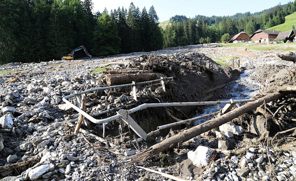 - La saturation des sols, les quantités d'eau cumulées et l'intensité des précipitations expliquent les glissements de terrain qui se sont produits localement. De nombreuses routes et voies ferrées ont été temporairement coupées (p. ex. la ligne de chemin de fer à Flamatt ou l'accident de train à Tiefencastel).