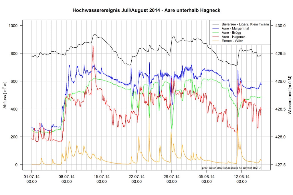 Crue de l’Aar en aval du lac de Bienne. Débits mesurés aux stations de l’OFEV entre le lac de Bienne et Murgenthal ainsi qu’à Emme-Wiler, de juillet à mi-août 2014.