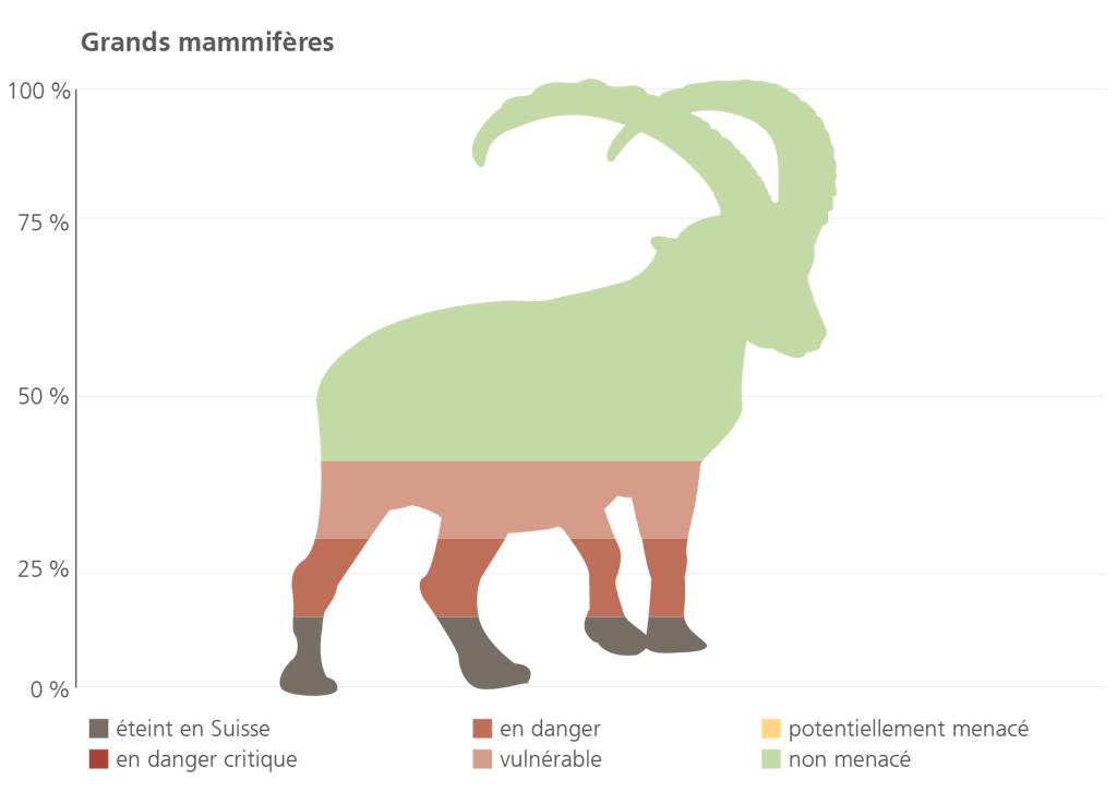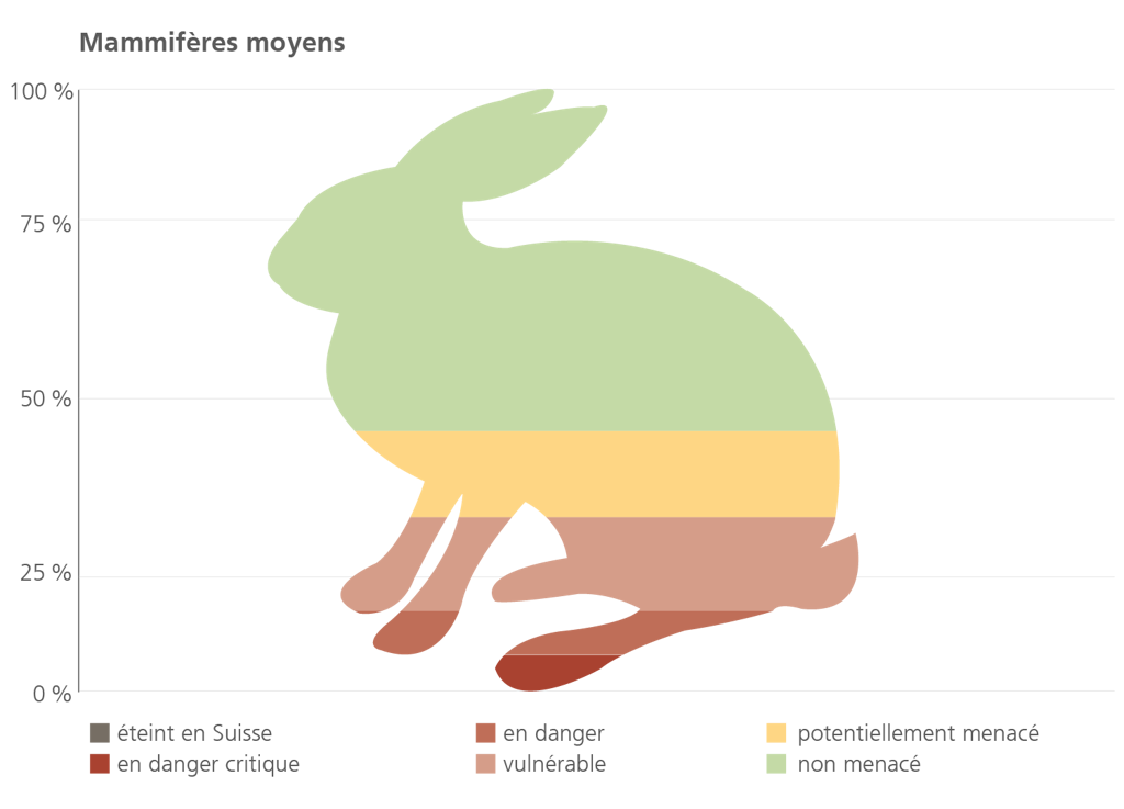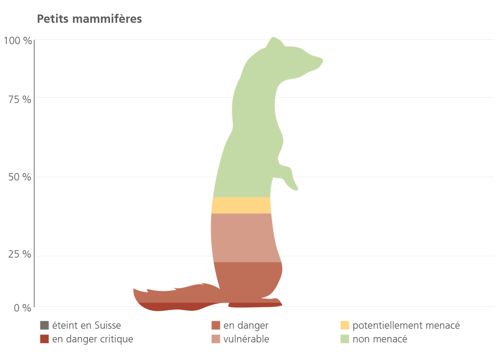 Parmi les 55 espèces indigènes de mammifères (hors chauves-souris), 20 sont menacéesÀ l’instar de la belette, nombre de ces espèces souffrent d’habitats monotones et insuffisamment reliés entre eux. Le manque de connectivité entre les habitats affecte notamment aussi les plus grandes espèces qui sont très mobiles et ont besoin de grands espaces, comme le cerf et le lynx.