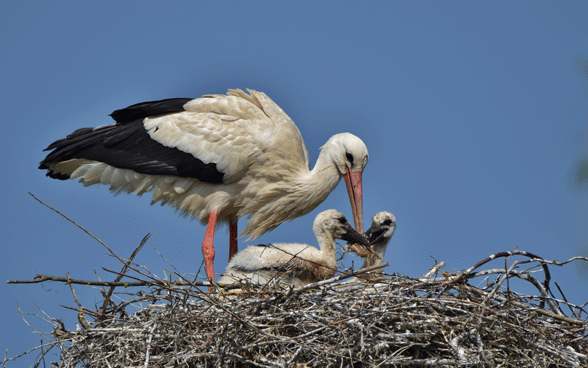 Des projets de conservation ciblés ont également permis à certaines espèces d’oiseaux de se rétablir. La cigogne blanche, une espèce typique peuplant les paysages ouverts riches en prairies humides et en zones alluviales, en constitue un bon exemple. Grâce à l’engagement de défenseurs des oiseaux et d’un plan d’action national, elle n’est plus considérée comme menacée dans la Liste rouge des oiseaux nicheurs.
