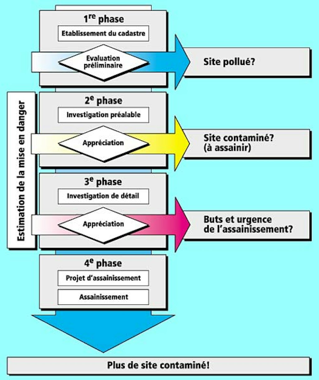 Les problèmes des sites contaminés doivent être abordés avec méthode pour éviter des frais disproportionnés. Il est recommandé de procéder selon le schéma décrit ci-dessous.