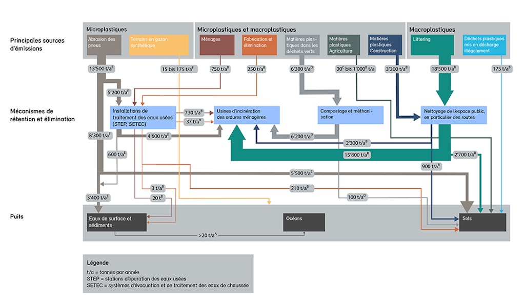 Une série de mesures existantes (p. ex. épuration des eaux usées, élimination des déchets, nettoyage des routes) permettent de réduire considérablement l’apport de matières plastiques dans l’environnement. En Suisse, la gestion des déchets urbains et des eaux usées ainsi que les services communaux contribuent donc de façon substantielle à éviter que des matières plastiques soient rejetées dans l’environnement. Ces mesures de nettoyage et ces mécanismes de rétention ne permettent toutefois pas d’intercepter la totalité des émissions : les déchets abandonnés (littering) ou les résidus de l’abrasion des pneus, par exemple, parviennent sous la forme d’apports diffus dans les eaux et les sols par ruissellement des eaux de pluie ou par dispersion dans l’air.