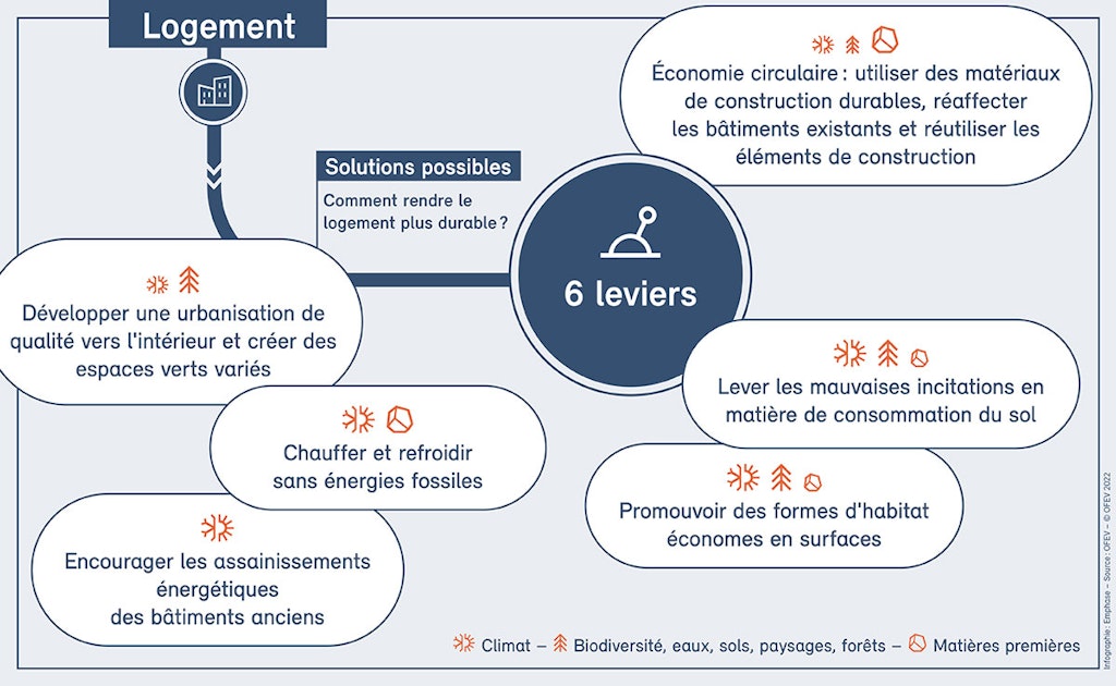 Le logement - après l'alimentation et avant la mobilité - est un des secteurs de consommation et de production qui génère le plus grand impact environnemental. Les conséquences négatives pourraient toutefois être nettement réduites grâce à différents leviers et pistes d’actions, comme p.ex. un développement urbain de qualité vers l’intérieur, reposant sur suffisamment d’espaces verts, sur l’aménagement et l’assainissement des bâtiments existants, sur une culture du bâti de qualité et sur de courtes distances. L’ensemble profite non seulement aux sols, à la biodiversité et au climat, mais également à la qualité de vie. Les assainissements énergétiques ainsi que les matériaux de construction écologiques, réutilisés ou recyclables possèdent en outre un potentiel élevé à l’égard de la réduction des besoins en énergie et en matériaux.