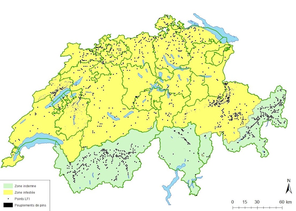 S’agissant des ORNQ, il n’existe en principe aucune obligation d’annoncer et d’éradiquer. Les éventuelles mesures de lutte ou de limitation des dommages sont laissées à la discrétion du propriétaire de forêt ou d’arbres. Le canton peut décider d’engager des mesures de lutte contre un ORNQ lorsque ce dernier menace sérieusement une fonction forestière. Les pins destinés à la plantation qui sont importés ou mis sur le marché à des fins commerciales doivent être exempts d’ORNQ. Il s’agit là de la seule obligation concernant ces organismes.