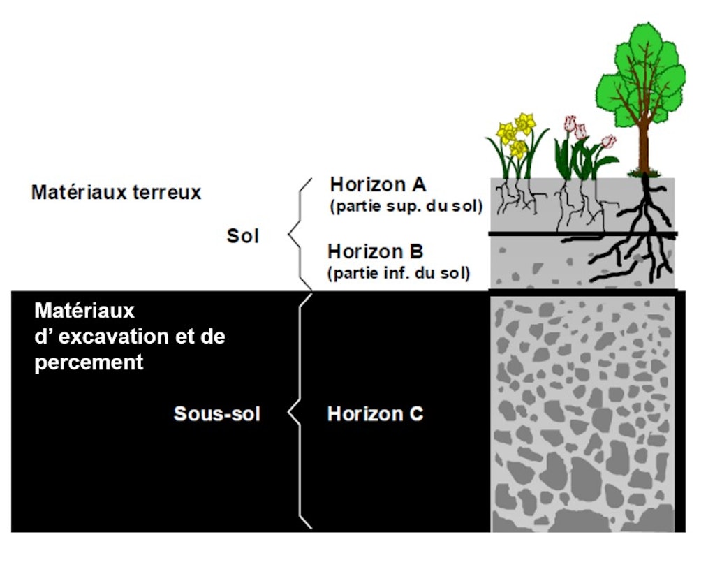 Notons que le terme de matériaux d’excavation et de percement recouvre à la fois les matériaux d’excavation et les déblais de percement. On entend par matériaux d’excavation tous les matériaux excavés depuis la couche géologique inférieure au sol vivant, autrement dit les roches meubles, le gravier et le sable. Lorsque des travaux de construction ont déjà été entrepris sur les emplacements dont ils proviennent (c.-à-d. quand ils sont issus de sites influencés par des activités anthropiques), ces matériaux peuvent contenir d’autres éléments tels que des déchets de chantier minéraux ou des résidus issus d’anciens lieux de stockage définitif de déchets.
