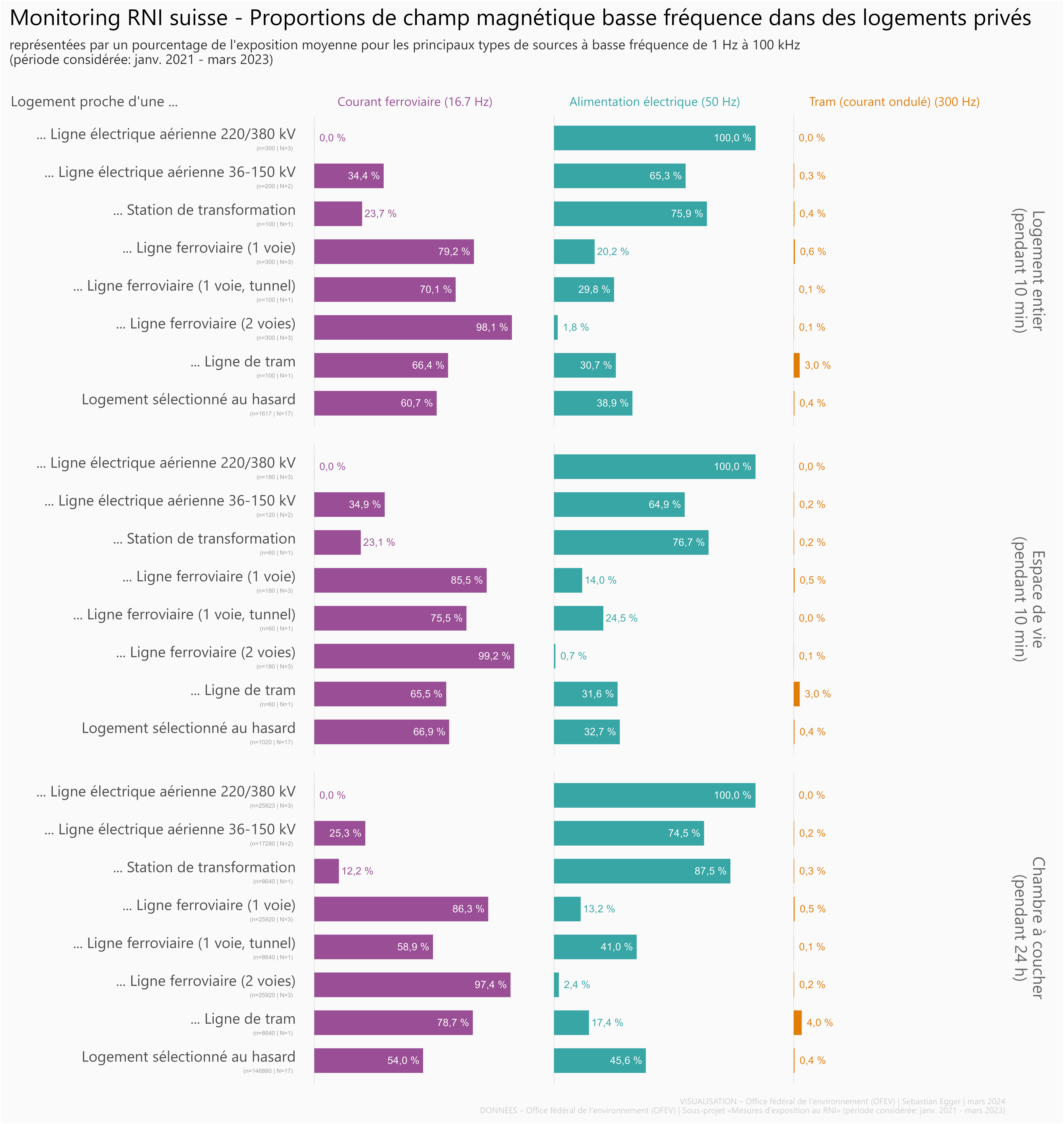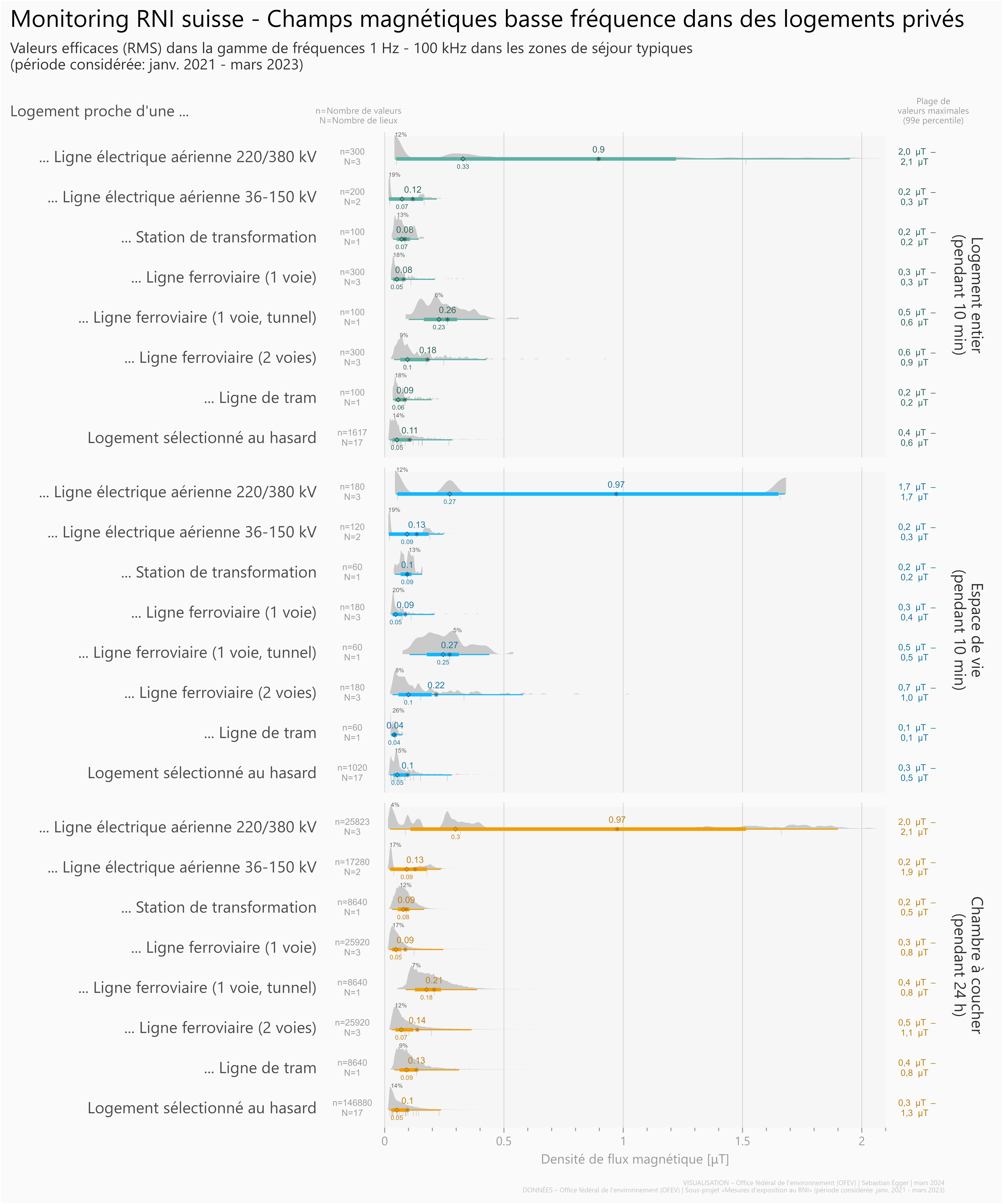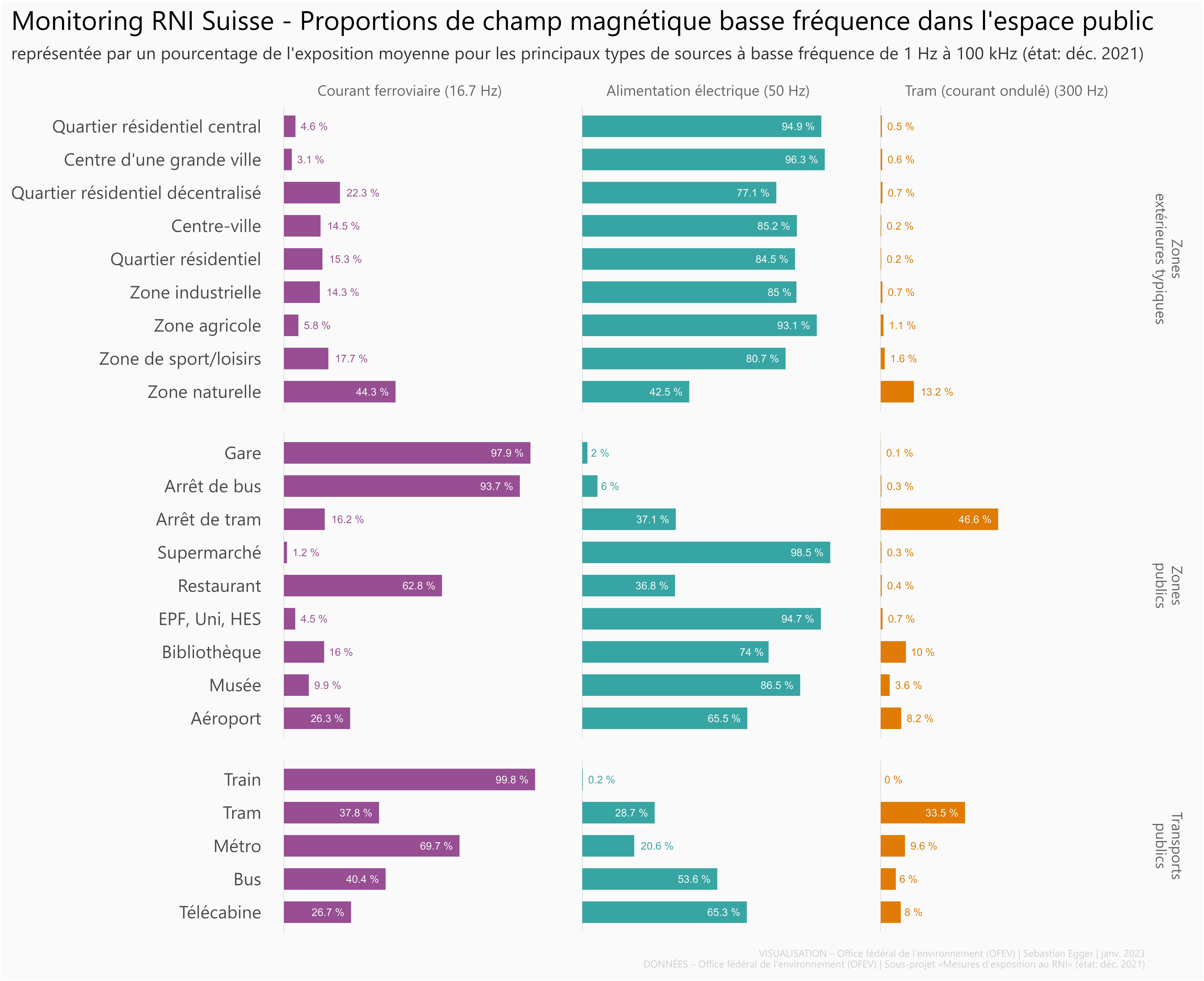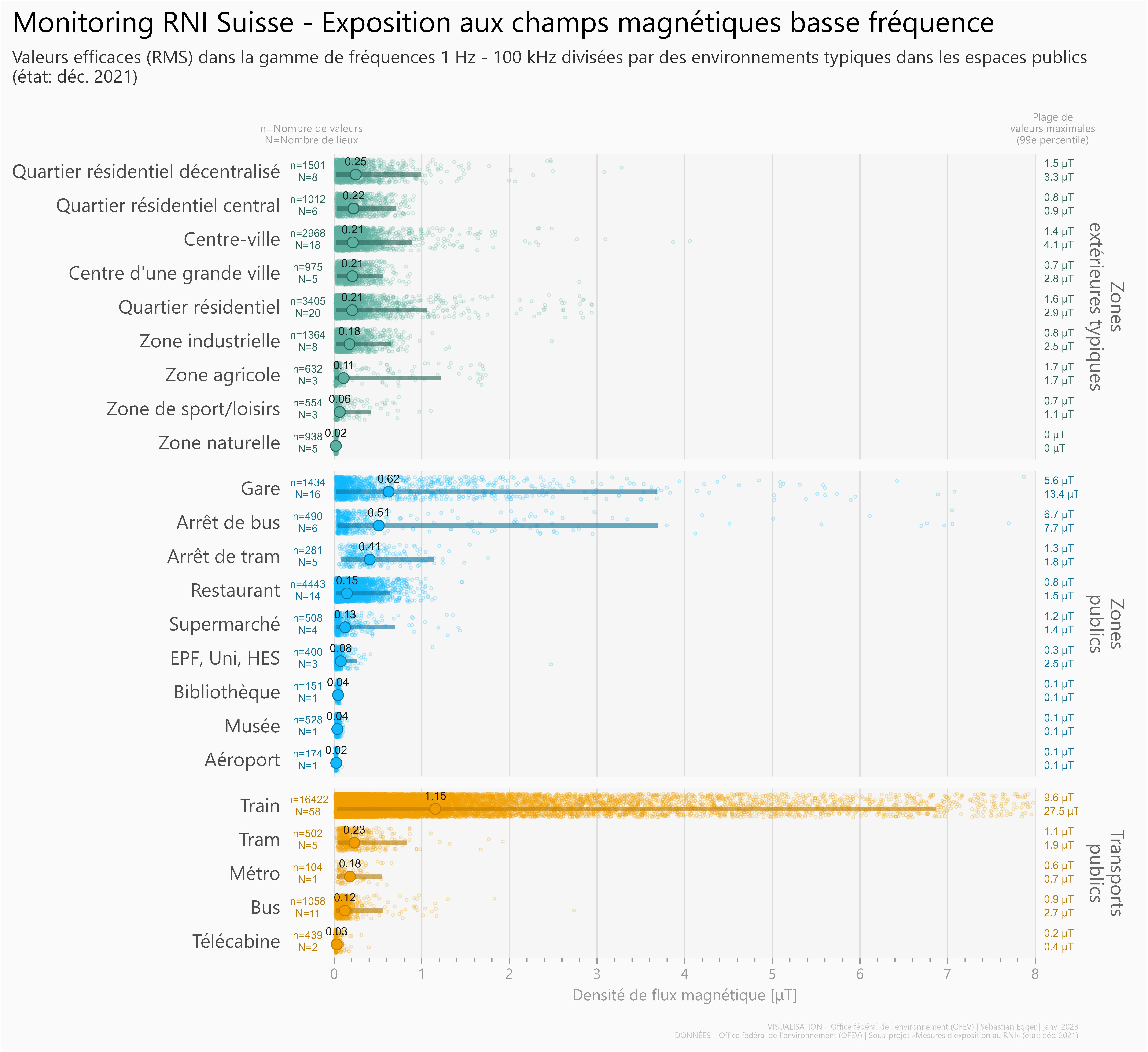 L’exposition aux champs magnétiques basse fréquence dans les zones accessibles au public se situe en moyenne (RMS) entre 0,03 et 2,47 µT. Les charges moyennes les plus élevées ont été mesurées dans les trains (2,47 µT) et les gares (1,60 µT) (cf. figure 10). C’est également dans les trains et les gares qu’ont été enregistrées les valeurs individuelles les plus élevées. Tous les résultats de mesure demeurent toutefois nettement inférieurs aux valeurs limites d’immissions..jpg?w=6840&auto=format)