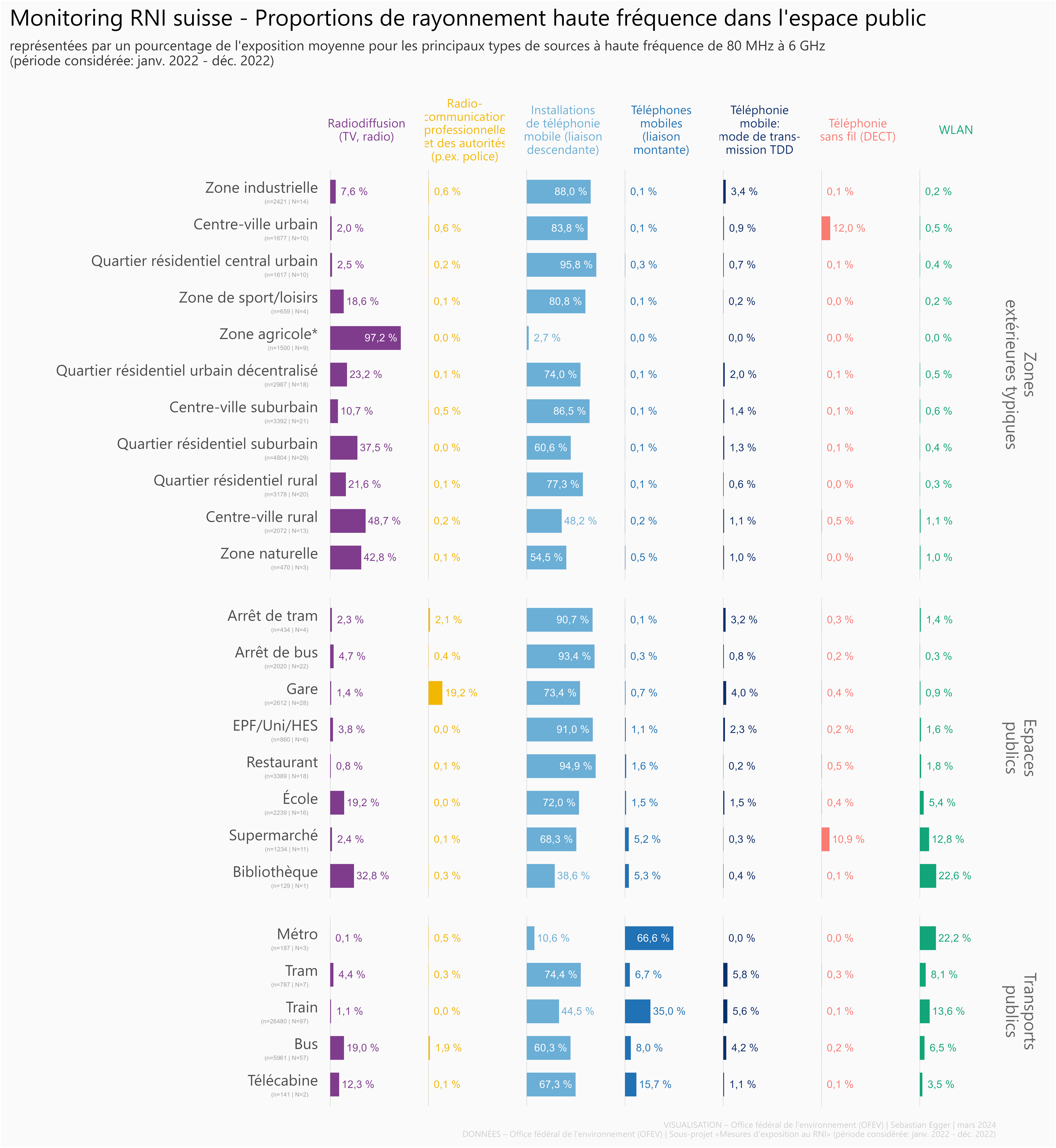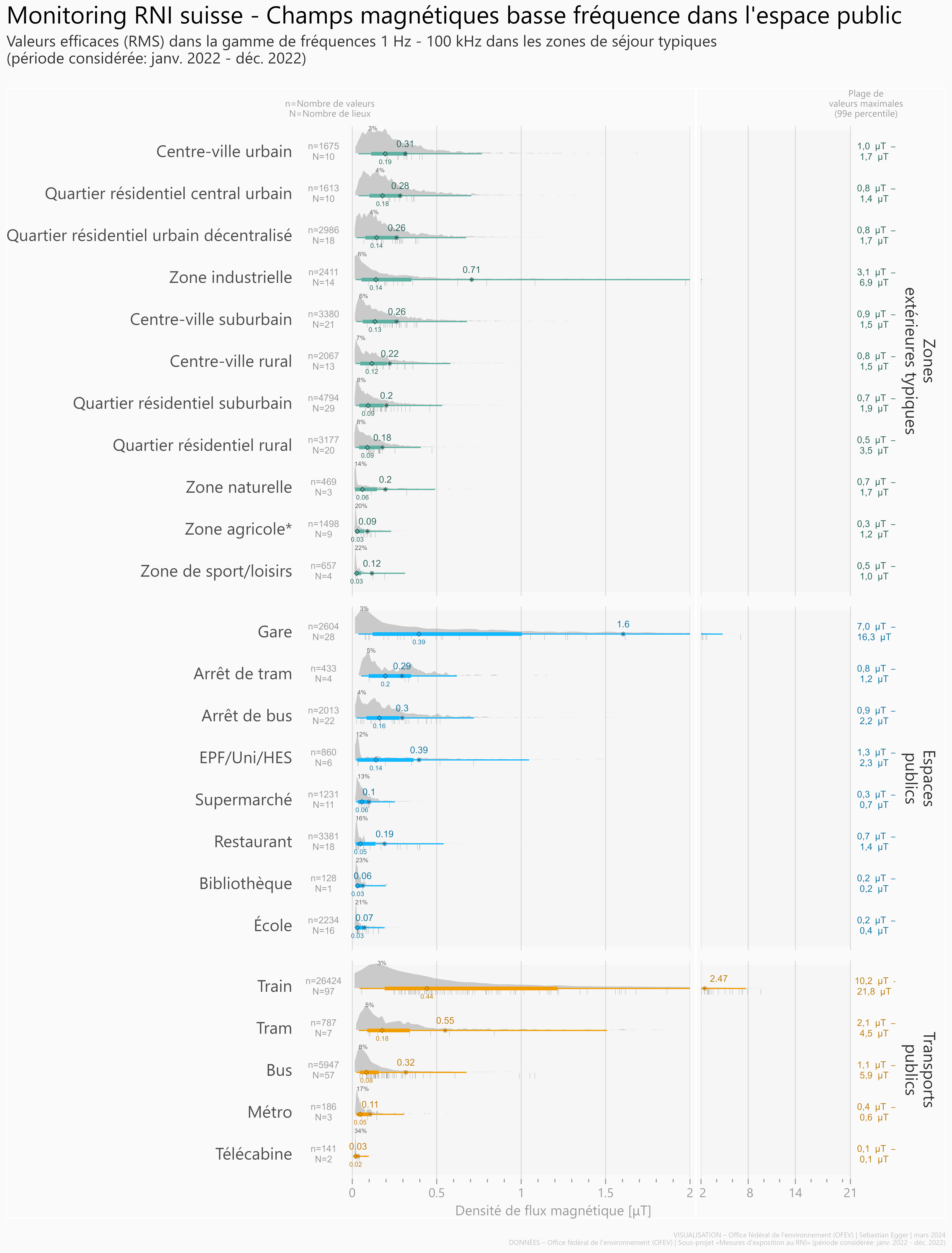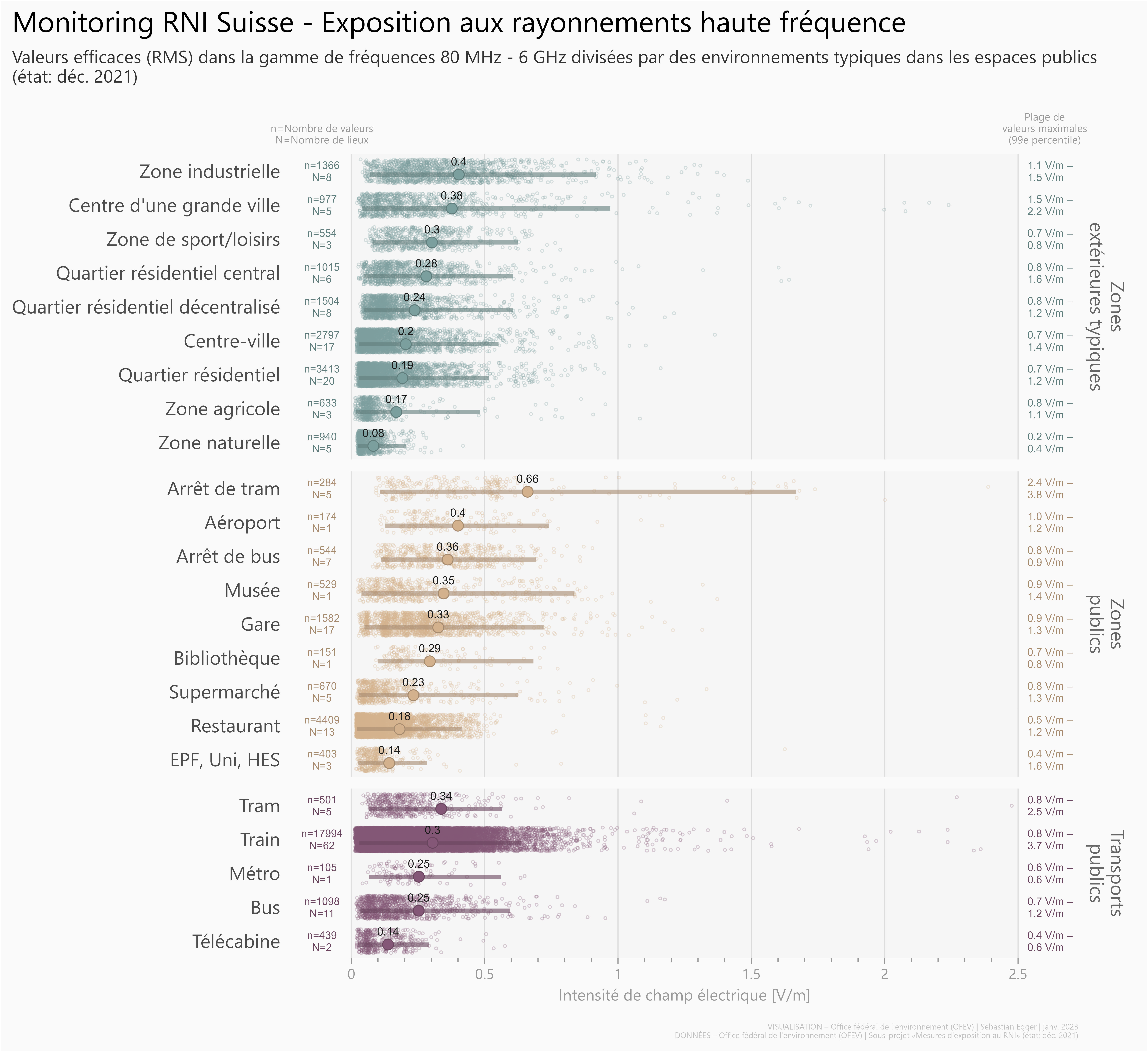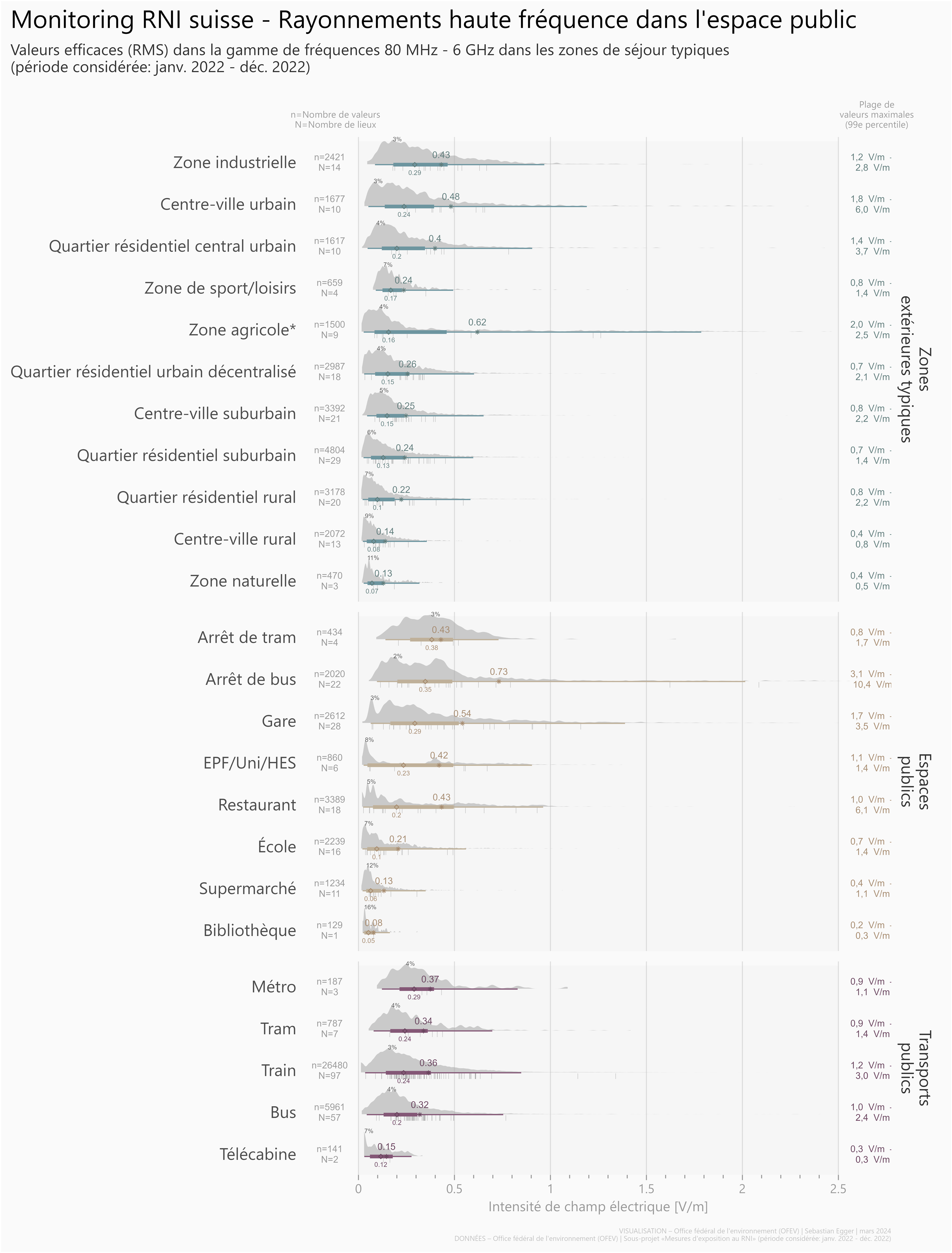 L’exposition au rayonnement haute fréquence mesurée en 2022 dans les espaces accessibles au public – autrement dit, les lieux où des personnes séjournent habituellement au quotidien – se situe en moyenne entre 0,13 et 0,73 V/m (moyenne quadratique, RMS). Ces valeurs, similaires à celles de l’année précédente, correspondent à un faible niveau d’exposition. Les valeurs moyennes les plus élevées (mais néanmoins encore basses) ont été mesurées aux arrêts de bus (0,73 V/m), dans les gares (0,54 V/m), dans les centres-villes urbains (0,48 V/m), aux arrêts de tram (0,43 V/m) et dans les zones industrielles (0,43 V/m). Les valeurs moyennes les plus basses ont été relevées dans les zones naturelles (0,13 V/m) et à caractère rural (0,14 à 0,22 V/m) ainsi que dans des supermarchés (0,13 V/m), des écoles (0,21 V/m) et une bibliothèque (0,08 V/m) (cf. figure 8). Toutes les données mesurées (soit env. 270 000) sont clairement – et souvent très nettement – inférieures aux valeurs limites d’immissions..jpg?w=6840&auto=format)