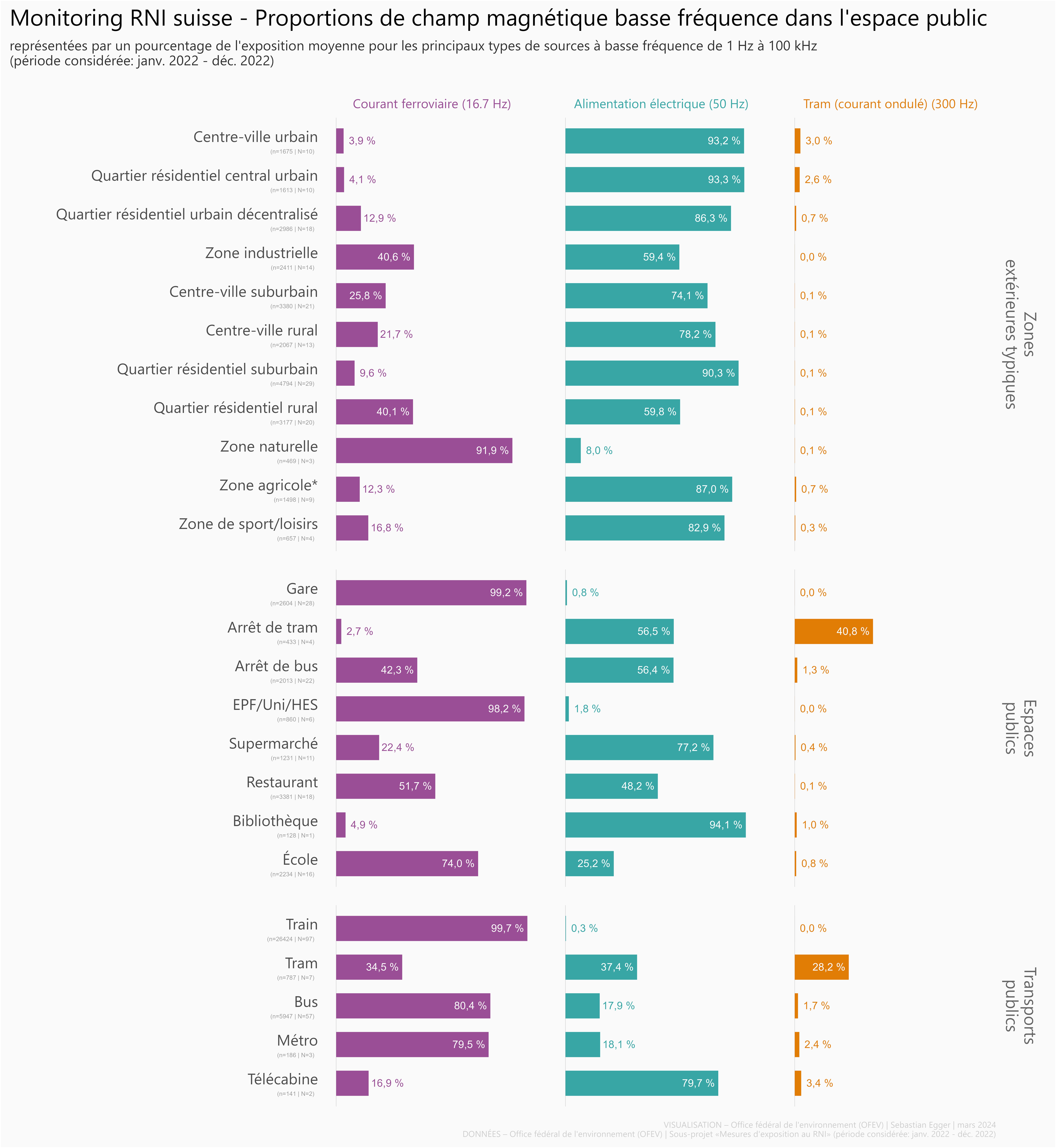 Figure 10 : Champs magnétiques basse fréquence dans l'espace public Dans la plupart des environnements de mesure, la majeure partie de la charge provient des champs magnétiques basse fréquence (50 Hz) des installations d’alimentation électrique. Il est plus rare que le courant ferroviaire (16,7 Hz) soit la source basse fréquence dominante, comme cela est par exemple le cas dans les gares ou les trains. Le fait que le courant ferroviaire représente la majeure partie de la charge basse fréquence dans les zones naturelles, les hautes écoles (EPF/Uni/HES) et les écoles a tout lieu de surprendre. La raison pourrait en être que certains lieux de mesure étaient situés à proximité d’un tronçon ferroviaire. Néanmoins, les charges imputables aux champs magnétiques basse fréquence sont si faibles dans ces lieux que l’on ne peut en tirer de conclusions d’ordre général sur les contributions moyennes (très faibles) des sources à l’exposition globale. Comme on pouvait s’y attendre, c’est dans les trams et aux arrêts de tram que la charge due au courant ondulé des trams (300 Hz) est la plus prononcée.
