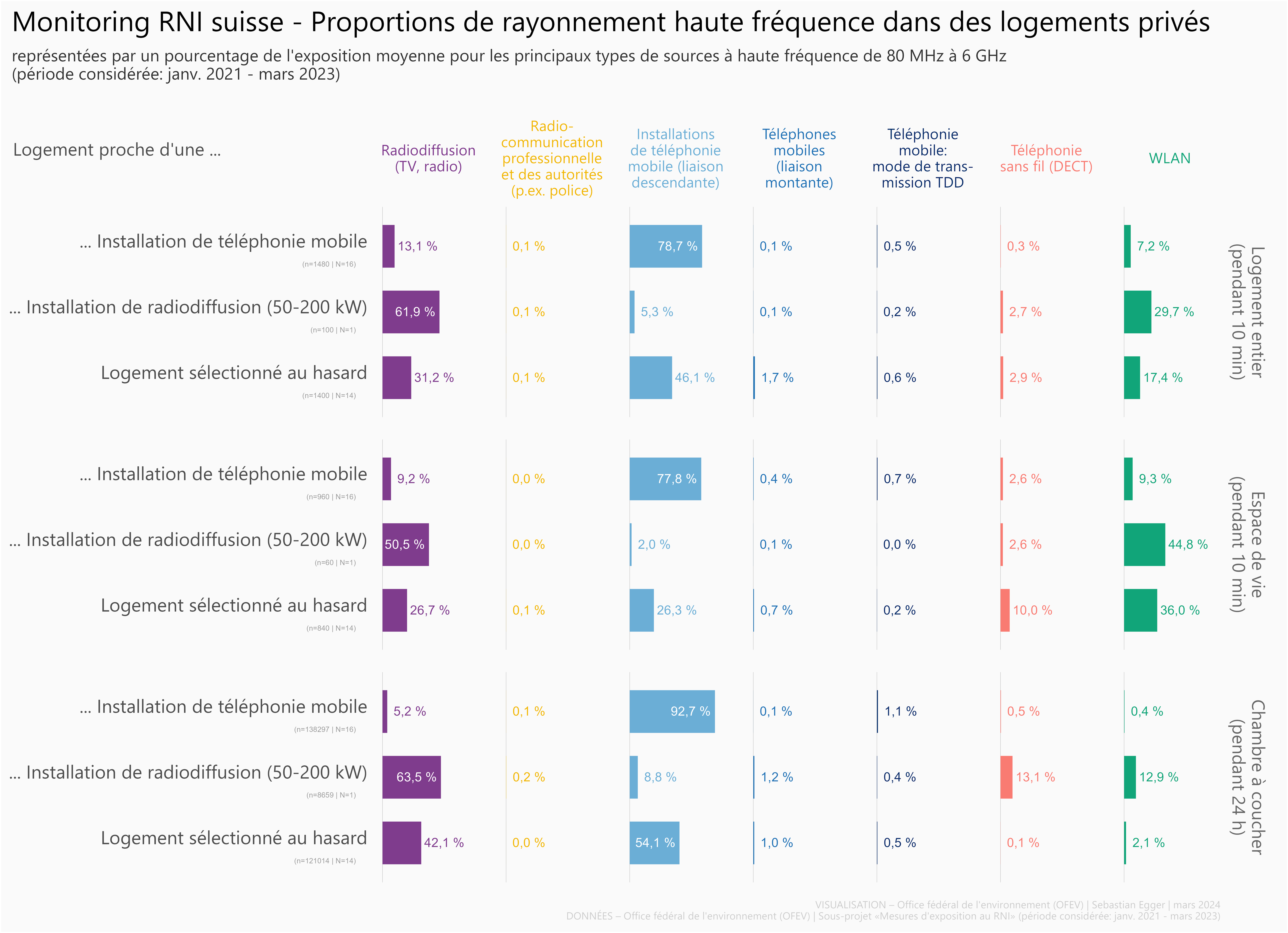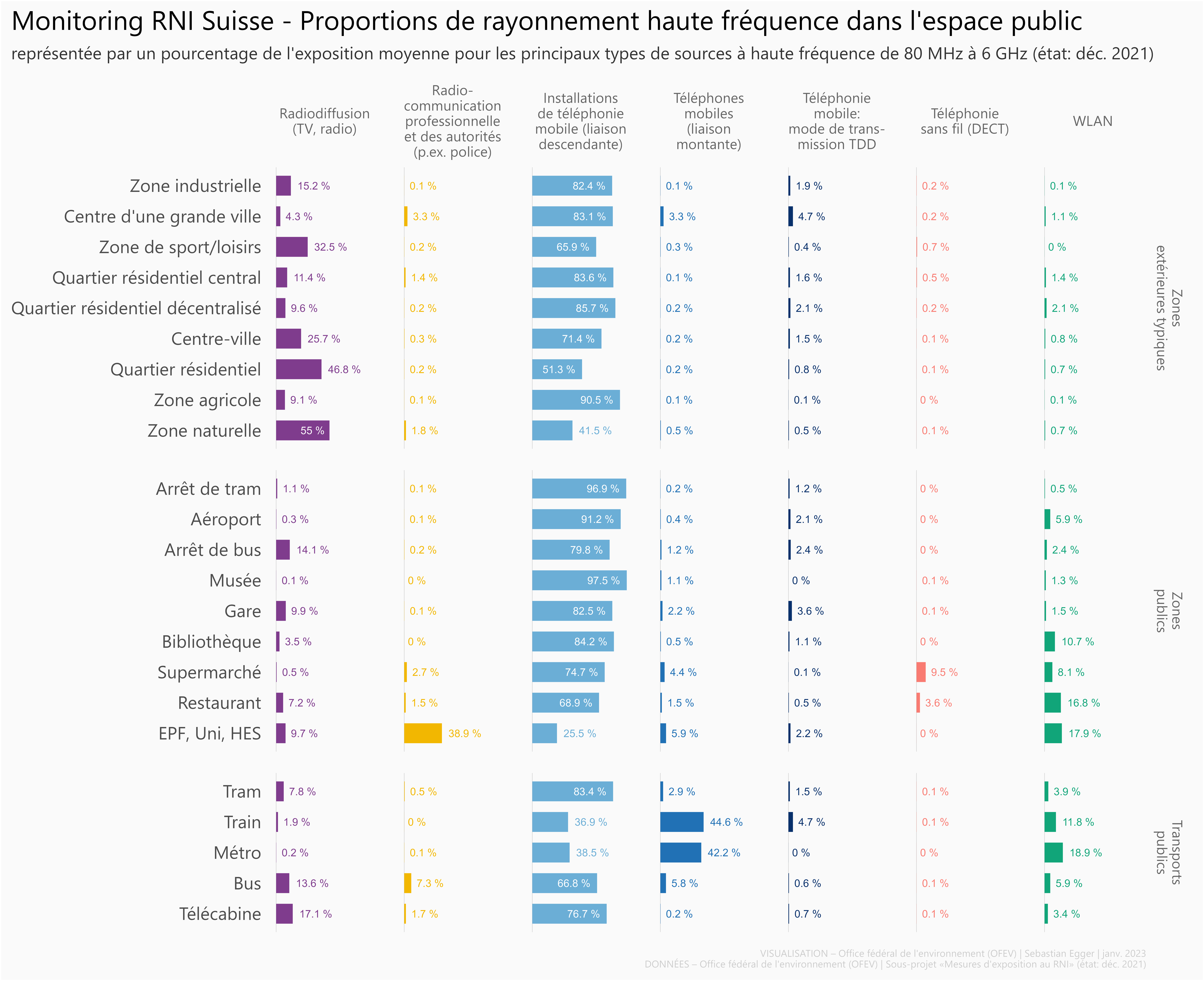 La comparaison avec une étude de 2014, réalisée sur mandat de l’OFEV avec un concept de mesure similaire, montre que l’exposition en 2021 se situe à un niveau similaire à celui de 2014 – malgré une multiplication par vingt du volume de données transmises par téléphonie mobile durant la même période [voir indicateur électrosmog (admin.ch)]. La poursuite et la répétition des mesures dans la série actuelle et les mesures permanentes stationnaires permettront d’effectuer d’autres analyses sur l’évolution temporelle de l’exposition au RNI.Quelles sources contribuent le plus à l'exposition ?