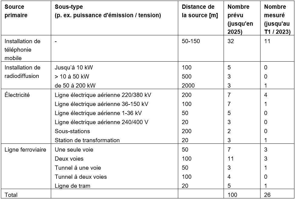 Jusqu'à fin 2022, des mesures d'itinéraires ont été effectuées dans 225 zones extérieures typiques de Suisse (sur un total de 300 prévues) pour évaluer l'exposition de la population au RNI. En outre, 158 mesures ont été effectuées dans des espaces publics (p. ex. restaurant, gare, supermarché) et 246 dans des transports publics (p. ex. bus, train, tram). La figure 3 présente sur une carte synoptique les zones extérieures et les espaces publics typiques sélectionnées pour les mesures de RNI. Jusqu'en mars 2023, 26 mesures (sur un total de 100 prévues) ont pu être effectuées dans des logements privés (voir tableau 1). Les mesures dans les logements privés accusent encore un certain retard en raison de la pandémie de Corona. En outre, depuis janvier 2023, cinq stations de mesure fixes sont exploitées et l’exposition y est mesurée en permanence depuis lors.