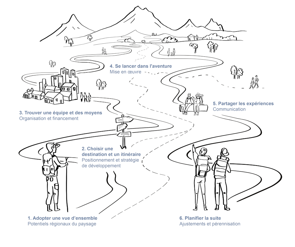 En collaboration avec le SECO, l’OFEV a élaboré un guide pratique simple pour inspirer et soutenir les personnes qui souhaitent monter un projet en lien avec le paysage. Le dessin ci-dessous illustre un chemin balisé. Toutefois, après avoir identifié les qualités et valeurs paysagères, il est important de se souvenir que plusieurs itinéraires peuvent mener à l’objectif et que certains détours sont parfois nécessaires. De nombreux services proposent leur soutien.