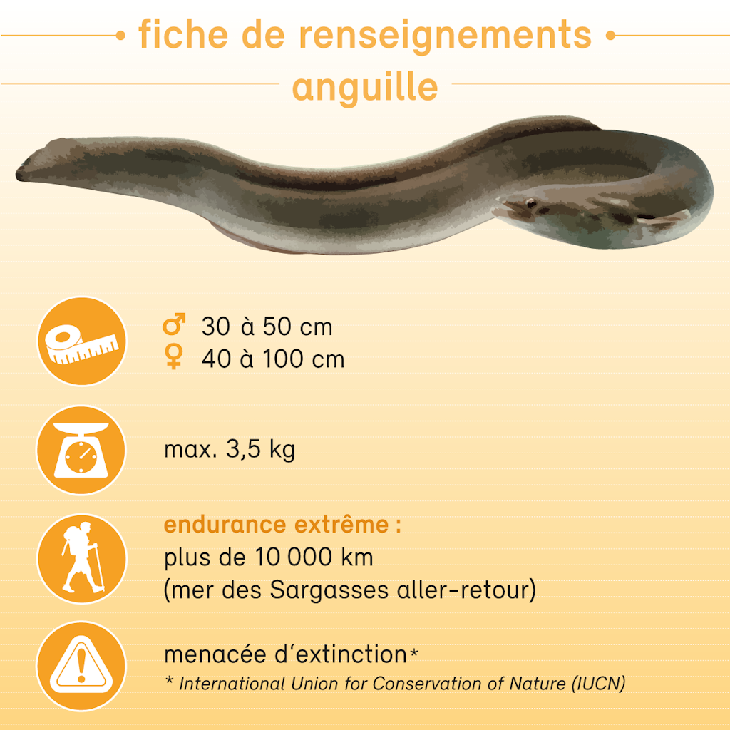 Dès que nous atteignons notre maturité sexuelle, notre instinct nous ramène à notre lieu de naissance. Nos couleurs nous valent à ce stade le nom d’« anguilles argentées ». Nous couvrons alors en une année des distances de plus de 5000 kilomètres. Il nous arrive parfois de nager à des profondeurs de 1000 mètres et d’avancer contre le courant du Gulf Stream. Le voyage n’est pas sans danger. Seuls quelques-uns d’entre nous atteignent les frayères et réussissent à se reproduire. Je vous conterai ci-après les difficultés auxquelles nous devons faire face dans les eaux suisses.