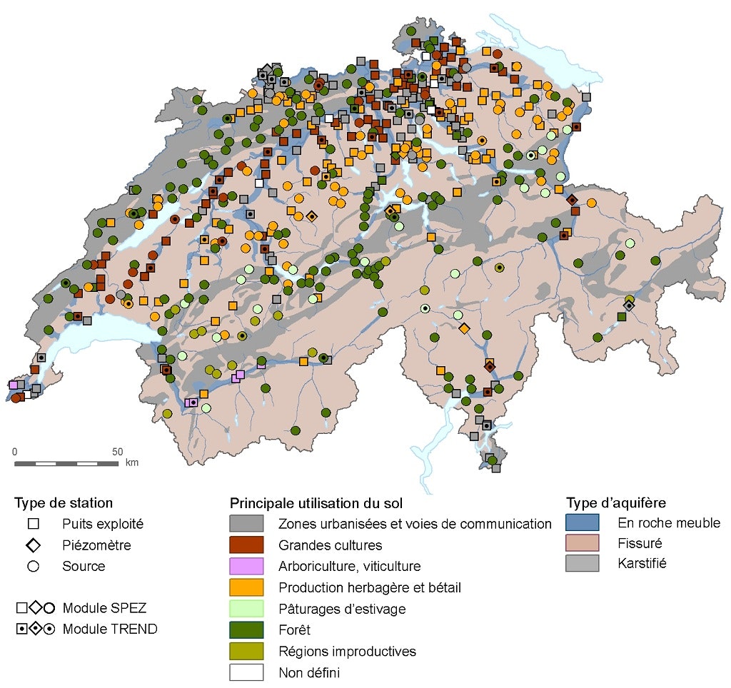 Le module SPEZ compte quelque 500 stations réparties sur l'ensemble de la Suisse et est géré depuis 2002 en étroite collaboration avec les cantons. Les stations de mesure couvrent les diverses régions du pays, les conditions hydrogéologiques en Suisse et notamment les impacts anthropiques définis sous forme de l'utilisation du sol dans le bassin versant des stations de mesure. La coordination de l'observation des eaux souterraines dans le cadre du module SPEZ garantit que les données relevées de manière homogène sur l'ensemble du pays sont comparables à l'échelle nationale, qu'elles sont disponibles sans discontinuité sur le long terme et de qualité élevée.