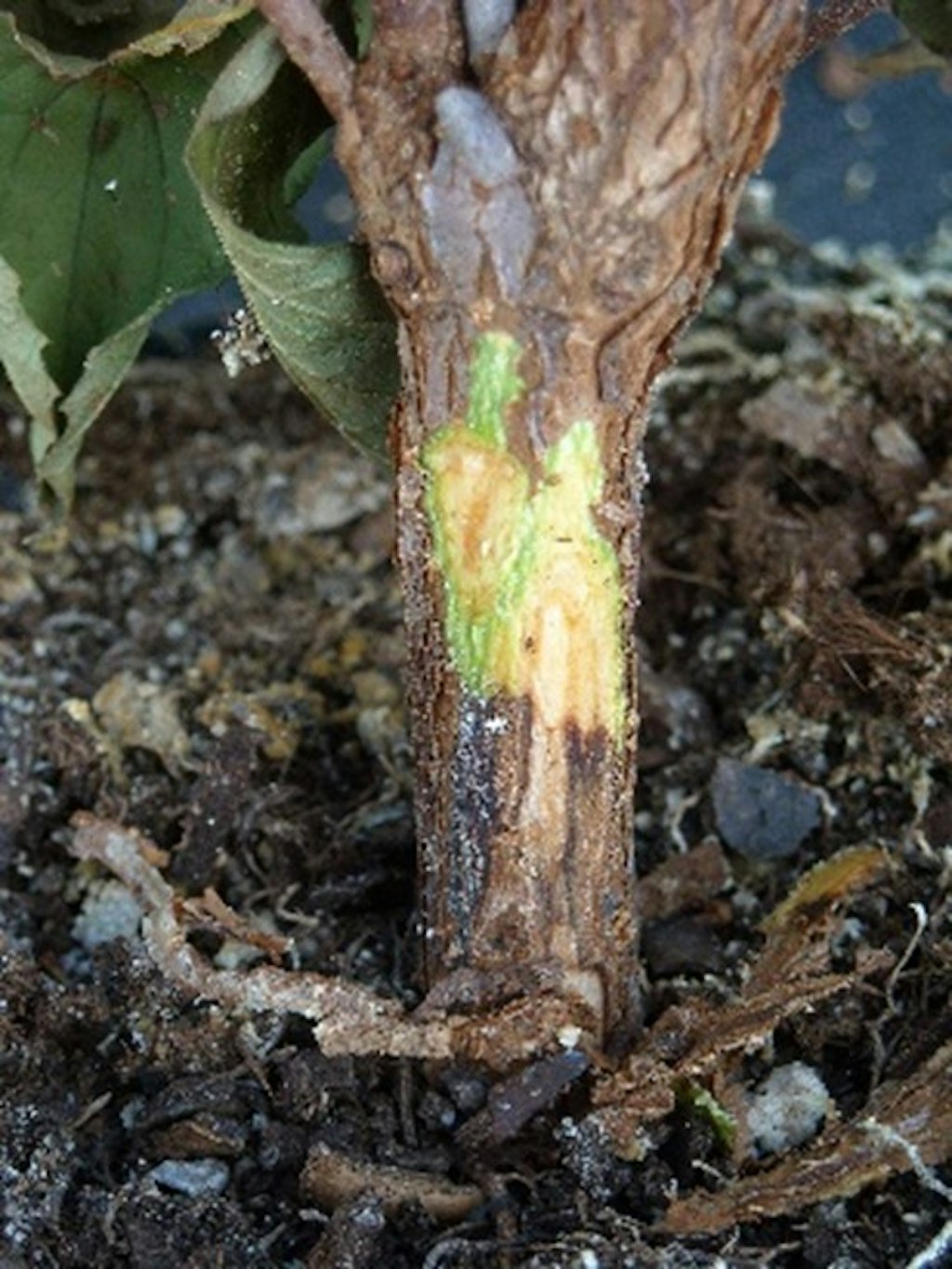 - Flétrissement éventuel des pousses, qui, le cas échéant, deviennent d’abord brun foncé, puis brun noir. Selon la plante, l’infection peut commencer à l’extrémité, au milieu ou à la base de la pousse, avant de s’étendre.