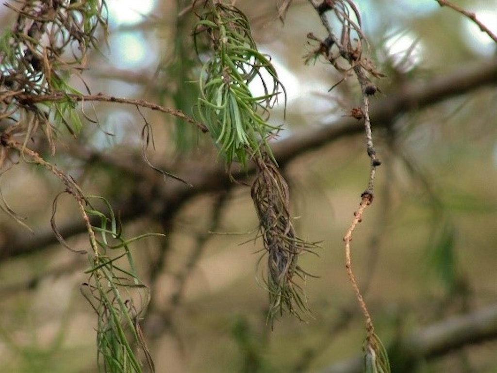 - Mélèzes : brunissement et chute des aiguilles ; nécrose de la couronne ; lésions et exsudats résineux au niveau du tronc.