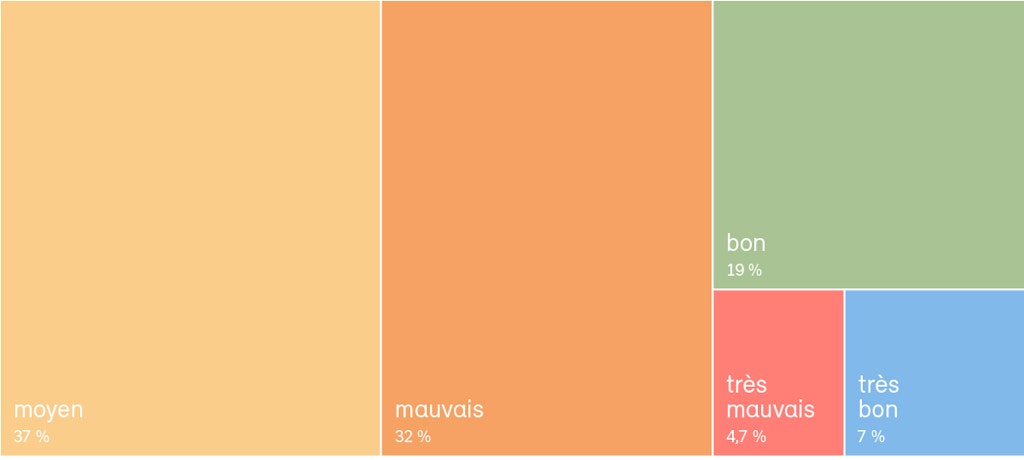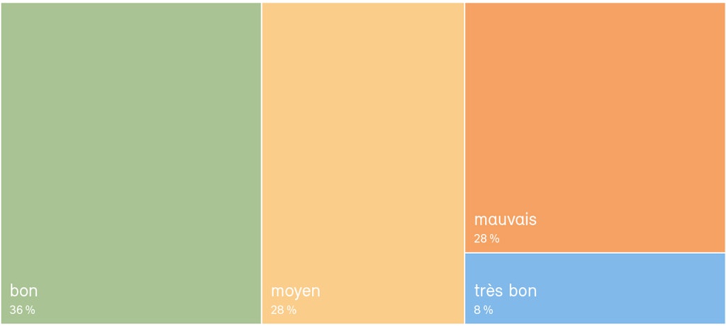 Les poissons fournissent de précieuses indications sur l’état des eaux : ils ont une longue durée de vie et sont sensibles à de nombreuses influences environnementales. Les analyses de leurs populations montrent que les tronçons de cours d’eau sont presque tous (72,6 %) dans un état insatisfaisant (voir graphique). Souvent, le nombre de poissons est insuffisant.